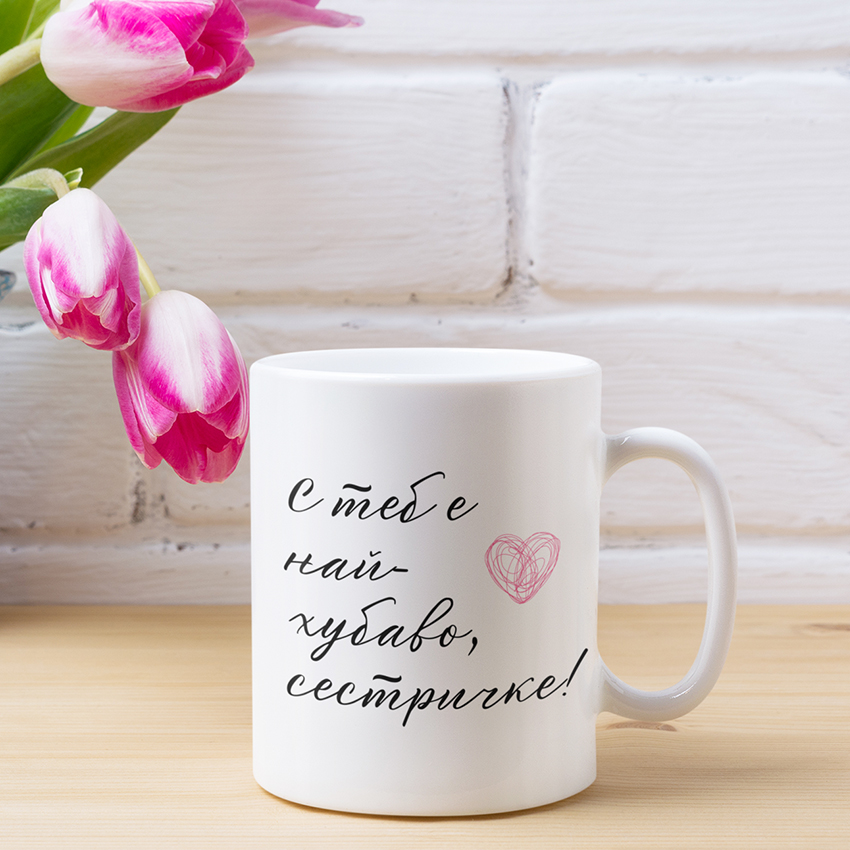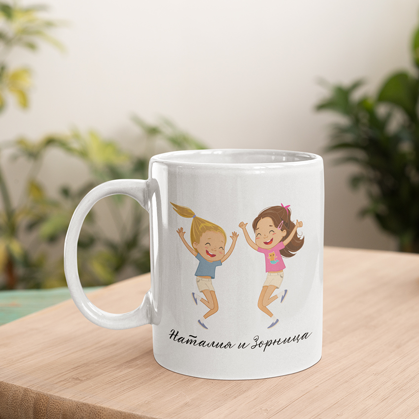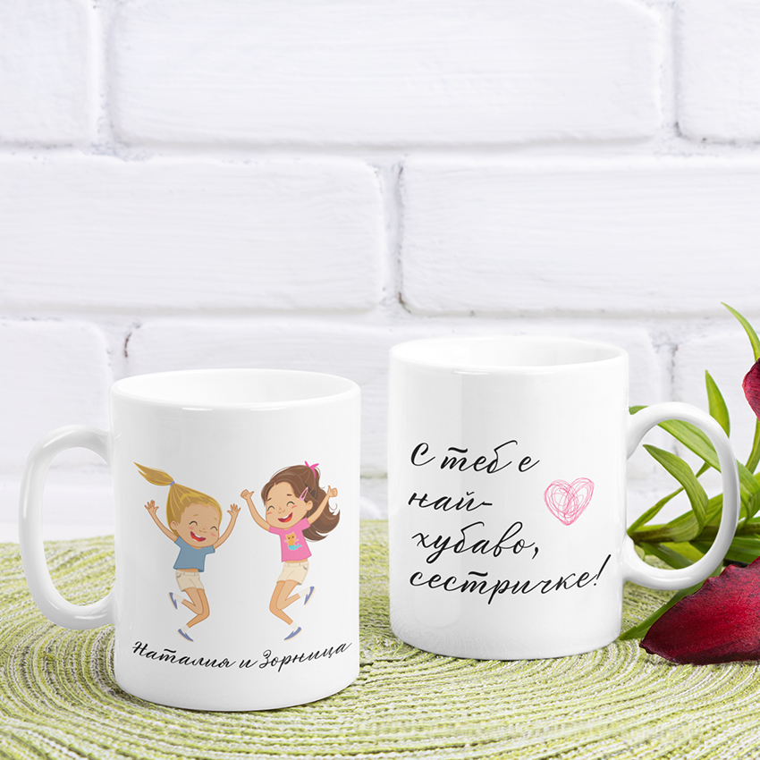 Чаша Най-Хубаво е част от колекцията ни чаши с надписи и картинки за добро настроение. Персонализирай я с имената на две сестрички за един наистина личен подарък!
