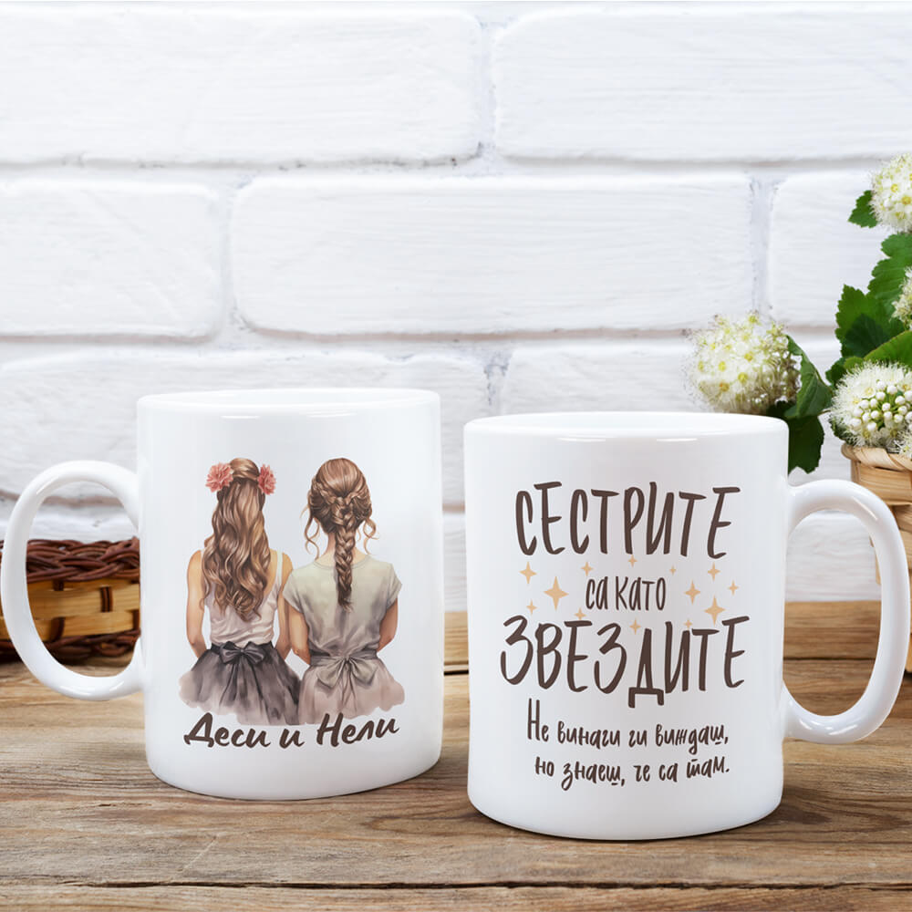 Тази чаша с послание е чудесна идея за подарък за сестри, включващ и персонализация на имената