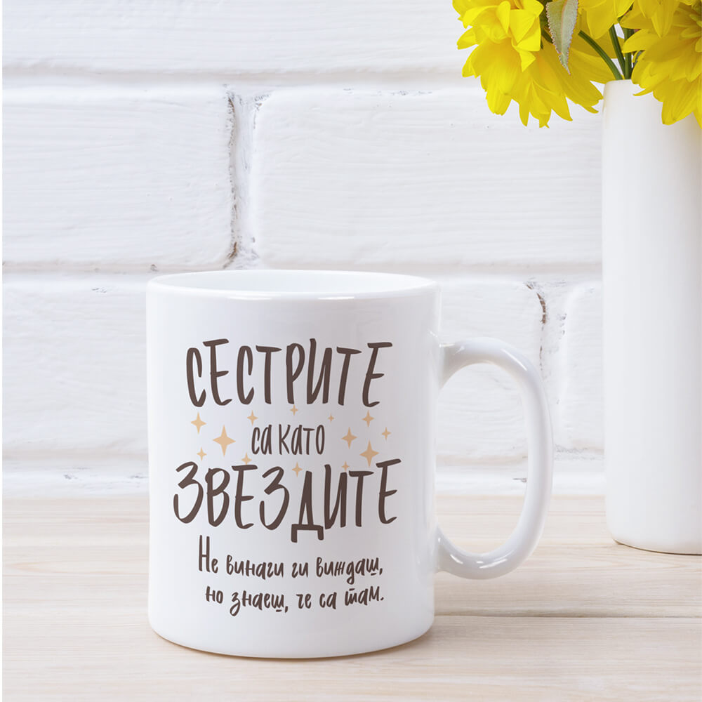 Чаша за Сестрите са Като Звезди е част от колекцията ни чаши с надписи за подарък. Този дизайн е чудесна идея за подарък за сестри.