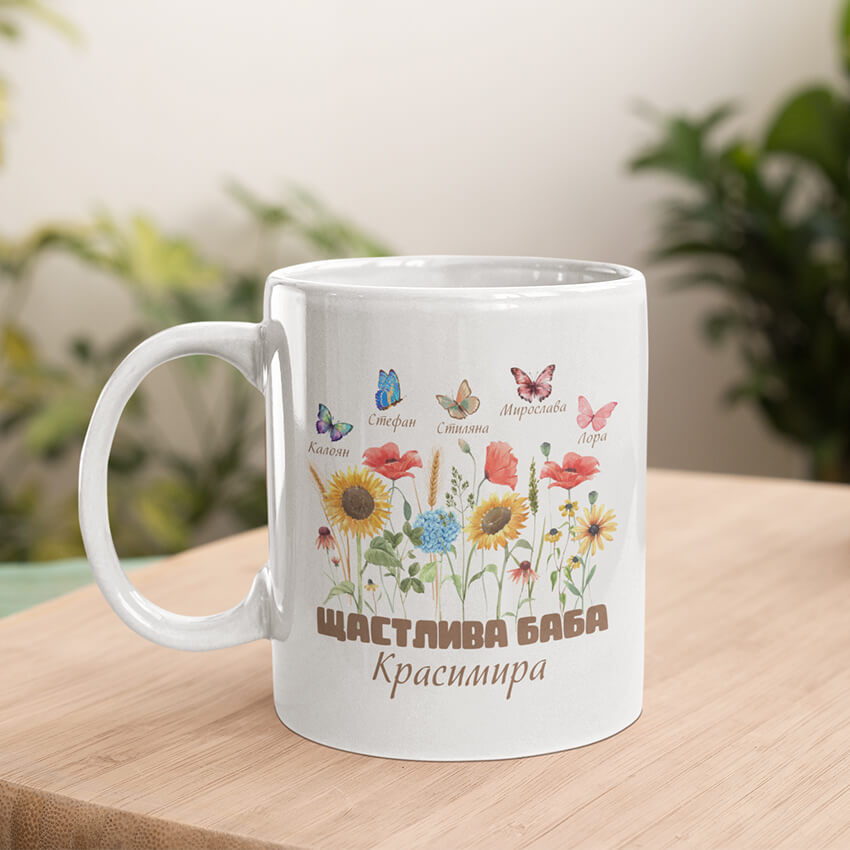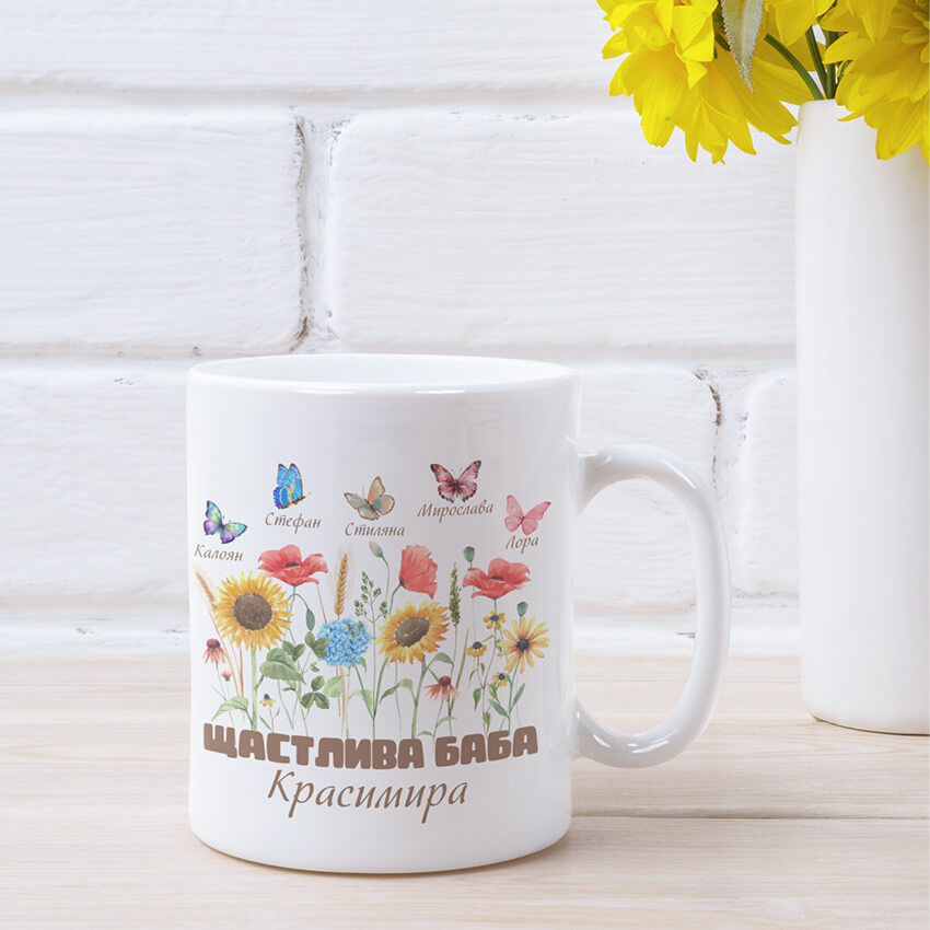 Чаша Щастлива Баба е част от колекцията ни чаши с надписи и картинки за добро настроение. Персонализирай я с името на бабата и с имената на всички внуци за един наистина личен подарък!