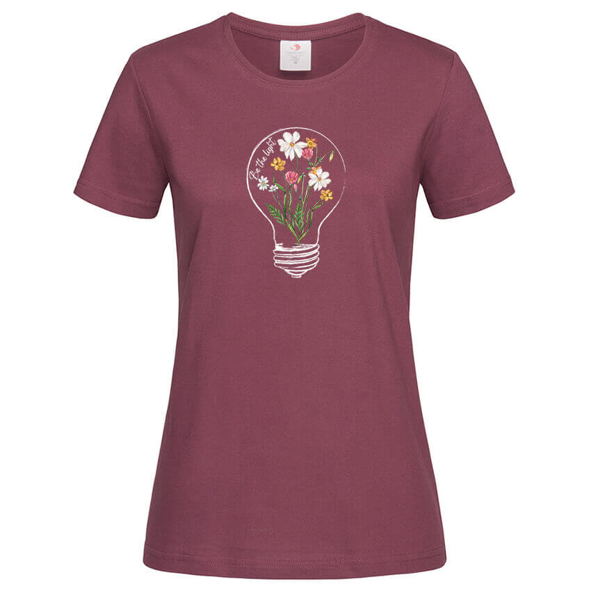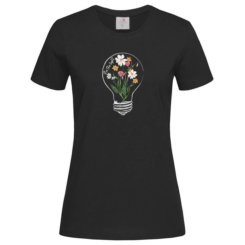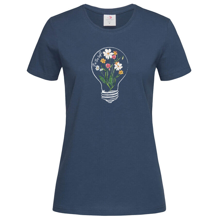 Дамска Тениска Be The Light e тениска с уникален дизайн от колекцията тениски с цветя, чудесно допълнение към твоят аутфит, създадена от In a MOOD – Онлайн магазин за тениски с щампи и надписи. Ние сме магазинът за настроение и създаваме дизайни на мъжки и дамски тениски. Стараем се да предлагаме забавни и оригинални дизайни на различни теми. Правим тениски, с които Вие да можете да изразите себе си по уникален начин. Ако имате нужда, можем да създадем и тениска по ваш дизайн. Можем също да променим по Ваше желание елементи в някои от предлаганите в магазина щампи и надписи. За целта само се свържете с нас чрез контактната форма на сайта или на email: info@inamood.bg. Предлагаме също така голямо разнообразие от ярки, светли и тъмни цветове – 17 цвята за мъжките и 17 цвята за дамските модели тениски. На различните дизайни сме поставили различни цветове, които пасват със съответния дизайн, но ако Вие искате друг цвят на тениската, не се колебайте да ни попитате. На ваше разположение сме за всякакви въпроси и информация относно магазина и предлаганите от нас продукти. Имаме една основна цел – да зарадваме и усмихнем колкото се може повече хора!