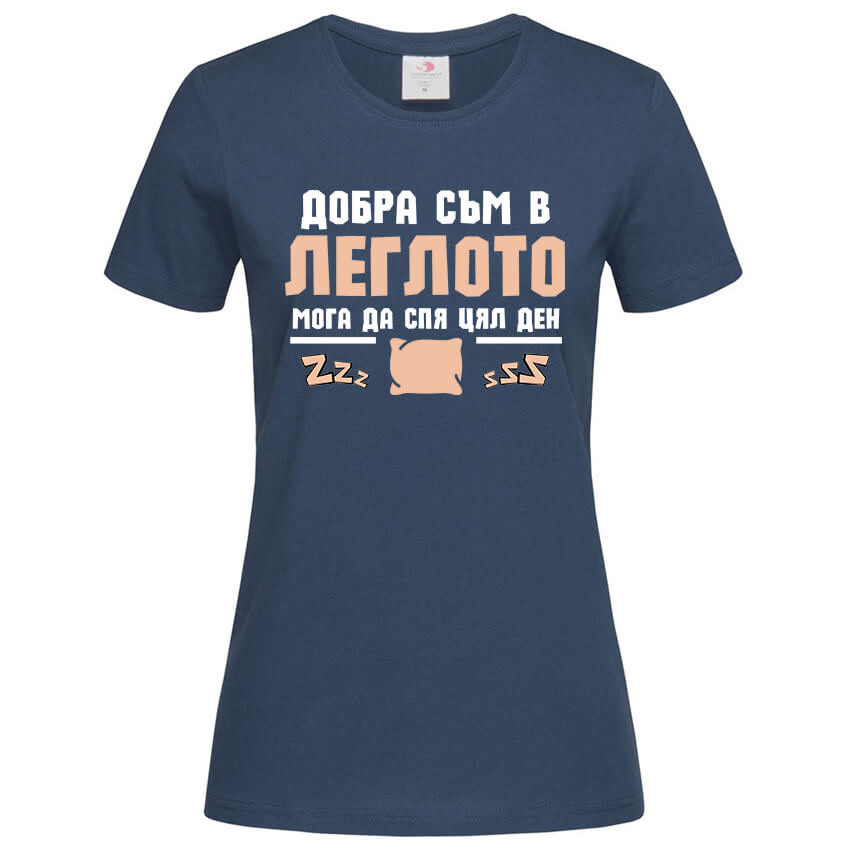 Дамска Тениска Добра Съм в Леглото e тениска със забавен дизайн, създадена от In a MOOD – Онлайн магазин за тениски с щампи и надписи. Ние сме магазинът за настроение и създаваме дизайни на мъжки и дамски тениски. Стараем се да предлагаме забавни и оригинални дизайни на различни теми. Правим тениски, с които Вие да можете да изразите себе си по уникален начин. Ако имате нужда, можем да създадем и тениска по ваш дизайн. Можем също да променим по Ваше желание елементи в някои от предлаганите в магазина щампи и надписи. За целта само се свържете с нас чрез контактната форма на сайта или на email: info@inamood.bg. Предлагаме също така голямо разнообразие от ярки, светли и тъмни цветове – 17 цвята за мъжките и 17 цвята за дамските модели тениски. На различните дизайни сме поставили различни цветове, които пасват със съответния дизайн, но ако Вие искате друг цвят на тениската, не се колебайте да ни попитате. На ваше разположение сме за всякакви въпроси и информация относно магазина и предлаганите от нас продукти. Имаме една основна цел – да зарадваме и усмихнем колкото се може повече хора!