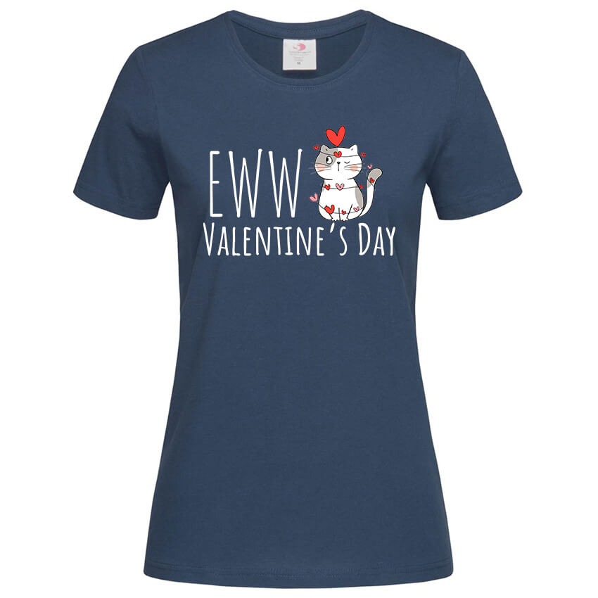 Дамска Тениска Eww Valentine’s Day e тениска със забавен дизайн за необвързаните на Свети Валентин, създадена от In a MOOD – Онлайн магазин за тениски с щампи и надписи. Ние сме магазинът за настроение и създаваме дизайни на мъжки и дамски тениски. Стараем се да предлагаме забавни и оригинални дизайни на различни теми. Правим тениски, с които Вие да можете да изразите себе си по уникален начин. Ако имате нужда, можем да създадем и тениска по ваш дизайн. Можем също да променим по Ваше желание елементи в някои от предлаганите в магазина щампи и надписи. За целта само се свържете с нас чрез контактната форма на сайта или на email: info@inamood.bg. Предлагаме също така голямо разнообразие от ярки, светли и тъмни цветове – 17 цвята за мъжките и 17 цвята за дамските модели тениски. На различните дизайни сме поставили различни цветове, които пасват със съответния дизайн, но ако Вие искате друг цвят на тениската, не се колебайте да ни попитате. На ваше разположение сме за всякакви въпроси и информация относно магазина и предлаганите от нас продукти. Имаме една основна цел – да зарадваме и усмихнем колкото се може повече хора!