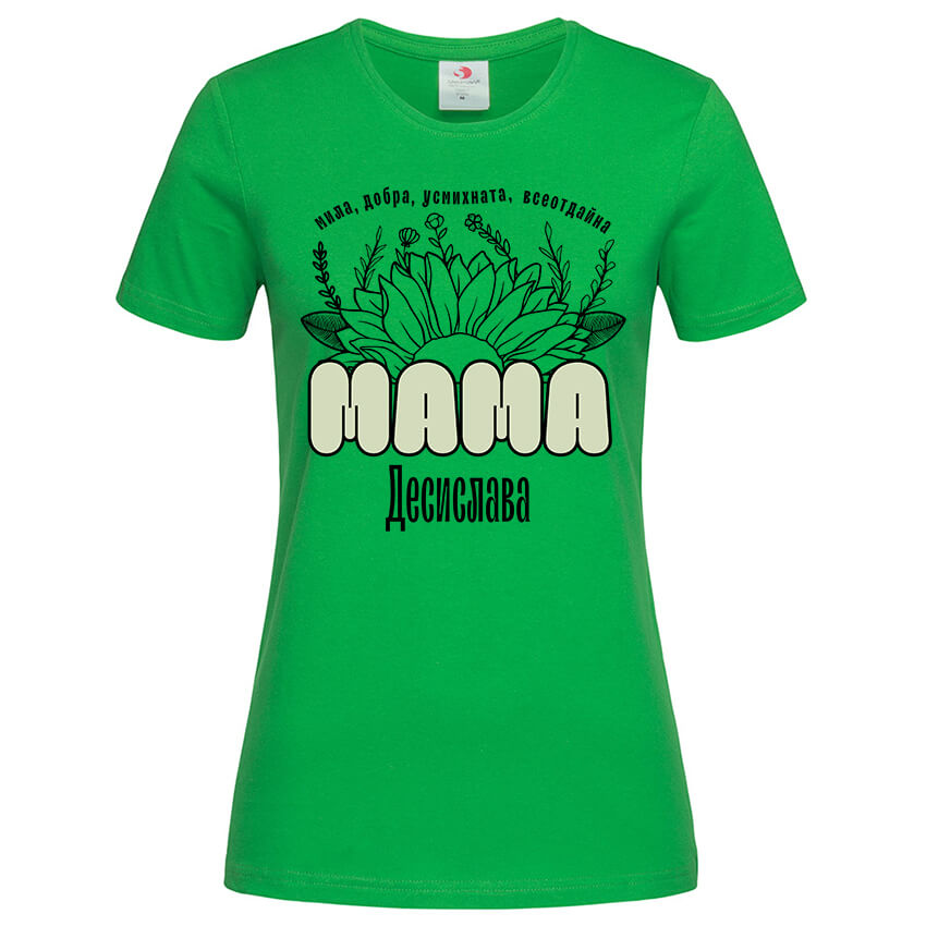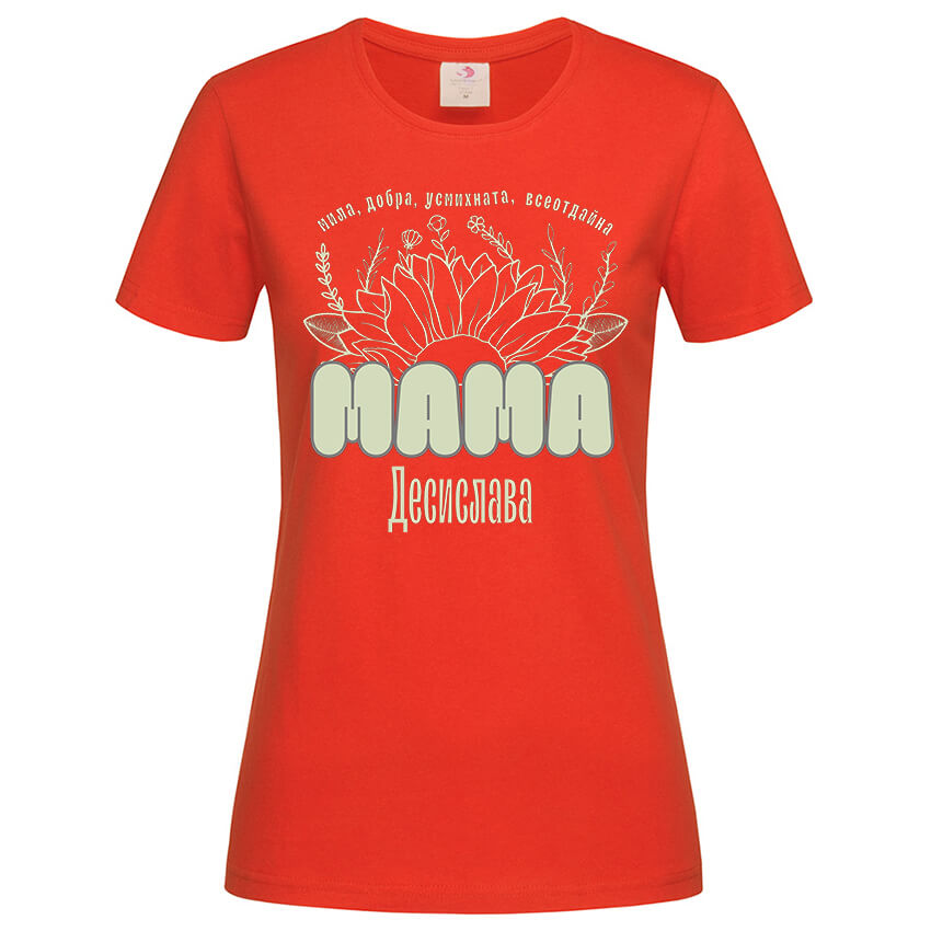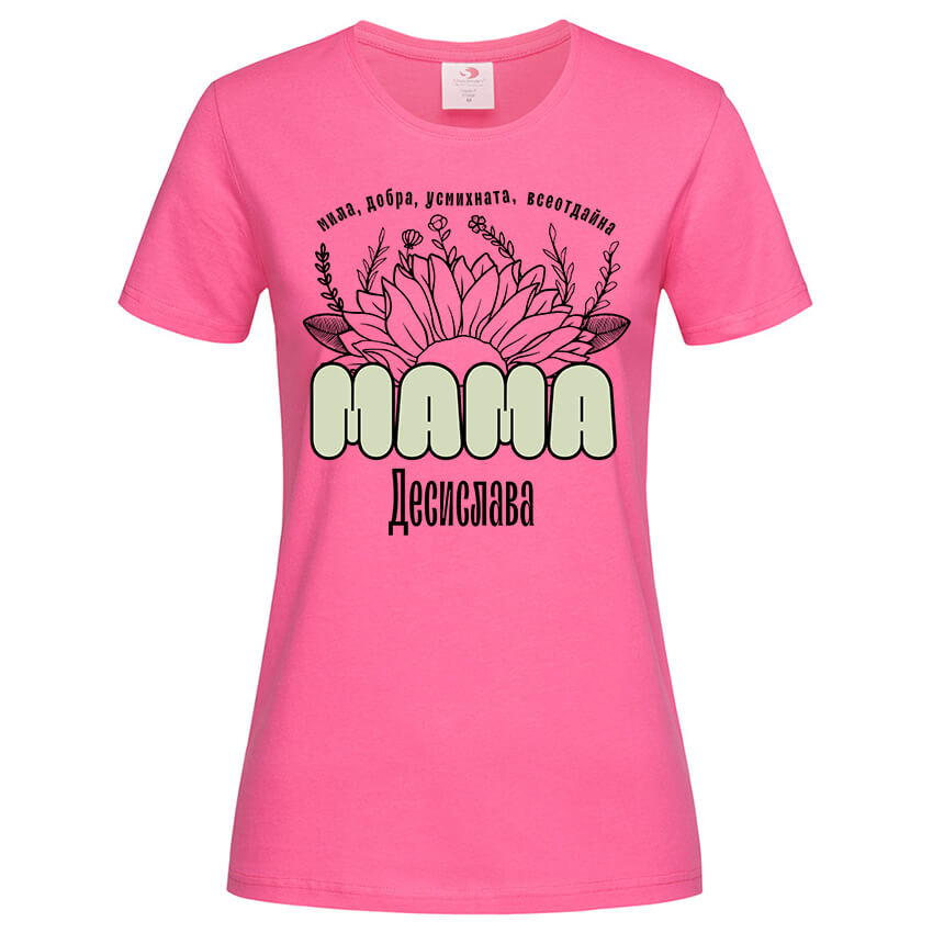 Дамска Тениска Името на Мама e тениска с оригинална щампа, създадена от In a MOOD – Онлайн магазин за тениски с щампи и надписи. Ние сме магазинът за настроение и създаваме дизайни на мъжки и дамски тениски. Стараем се да предлагаме забавни и оригинални дизайни на различни теми. Правим тениски, с които Вие да можете да изразите себе си по уникален начин. Ако имате нужда, можем да създадем и тениска по ваш дизайн. Можем също да променим по Ваше желание елементи в някои от предлаганите в магазина щампи и надписи. За целта само се свържете с нас чрез контактната форма на сайта или на email: info@inamood.bg. Предлагаме също така голямо разнообразие от ярки, светли и тъмни цветове – 17 цвята за мъжките и 17 цвята за дамските модели тениски. На различните дизайни сме поставили различни цветове, които пасват със съответния дизайн, но ако Вие искате друг цвят на тениската, не се колебайте да ни попитате. На ваше разположение сме за всякакви въпроси и информация относно магазина и предлаганите от нас продукти. Имаме една основна цел – да зарадваме и усмихнем колкото се може повече хора!