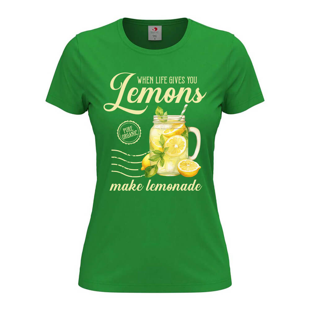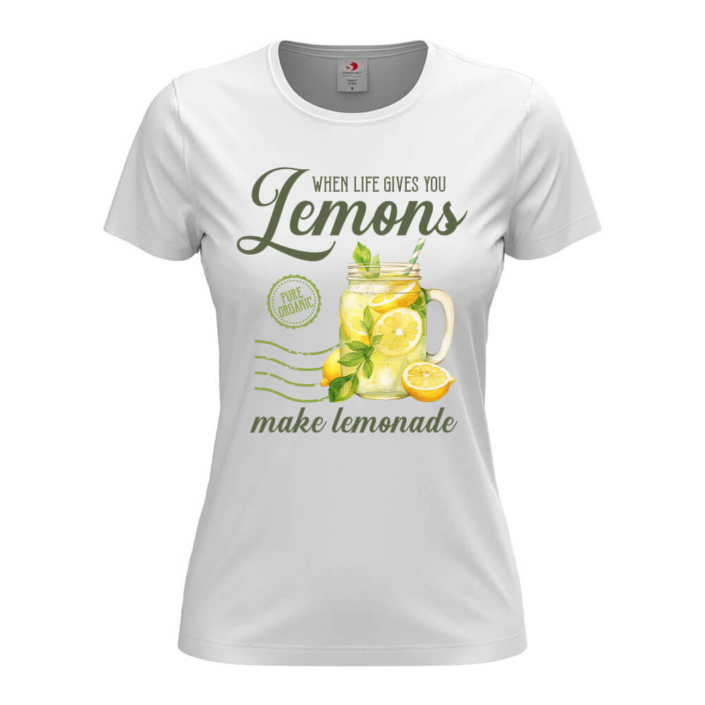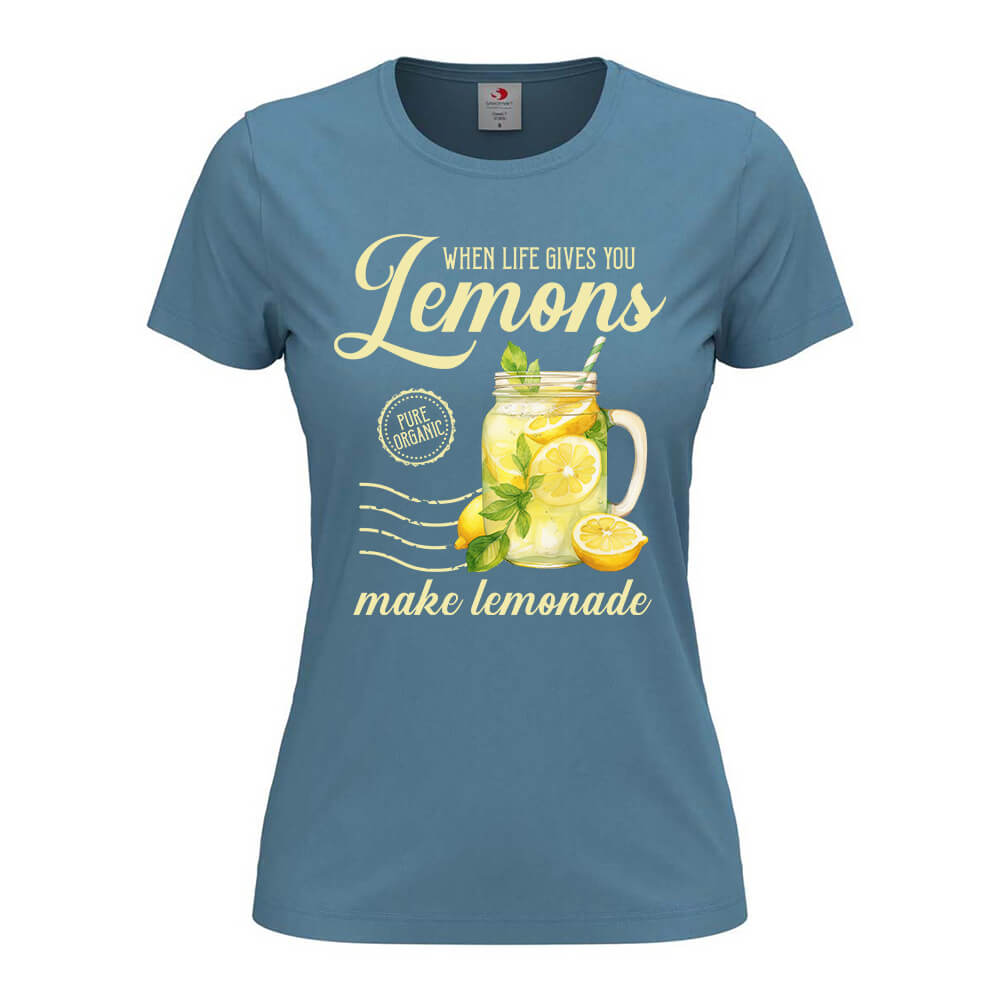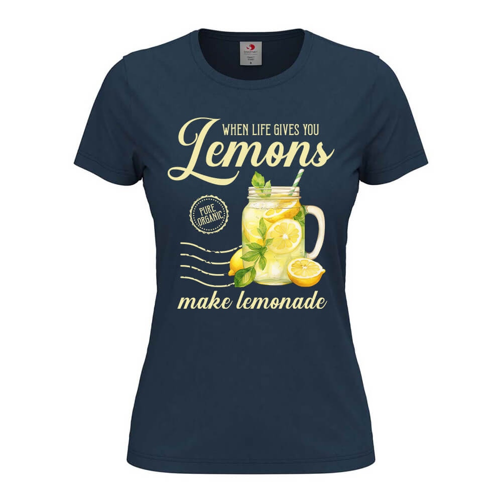 Дамска Тениска Lemonade, създадена от In a MOOD – Онлайн магазин за тениски с щампи и надписи. Ние сме магазинът за настроение и създаваме дизайни на мъжки и дамски тениски. Стараем се да предлагаме забавни и оригинални дизайни на различни теми. Правим тениски, с които Вие да можете да изразите себе си по уникален начин. Ако имате нужда, можем да създадем и тениска по Ваш дизайн. Можем също да променим по Ваше желание елементи в някои от предлаганите в магазина щампи и надписи. За целта само се свържете с нас чрез контактната форма на сайта или на email: info@inamood.bg. Предлагаме също така голямо разнообразие от ярки, светли и тъмни цветове – 17 цвята за мъжките и 17 цвята за дамските модели тениски. На различните дизайни сме поставили различни цветове, които пасват със съответния дизайн, но ако Вие искате друг цвят на тениската, не се колебайте да ни попитате. На Ваше разположение сме за всякакви въпроси и информация относно магазина и предлаганите от нас продукти. Имаме една основна цел – да зарадваме и усмихнем колкото се може повече хора!