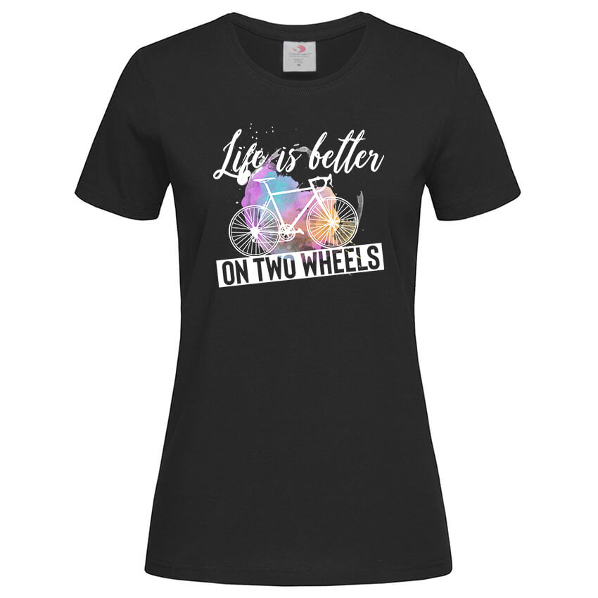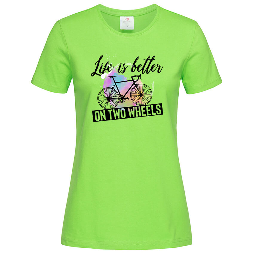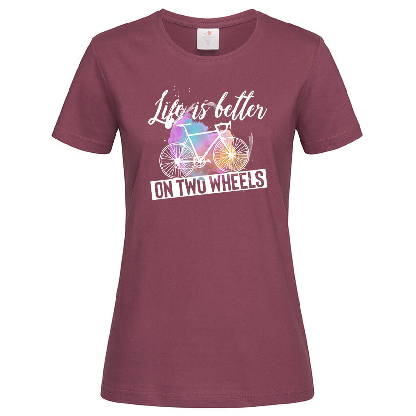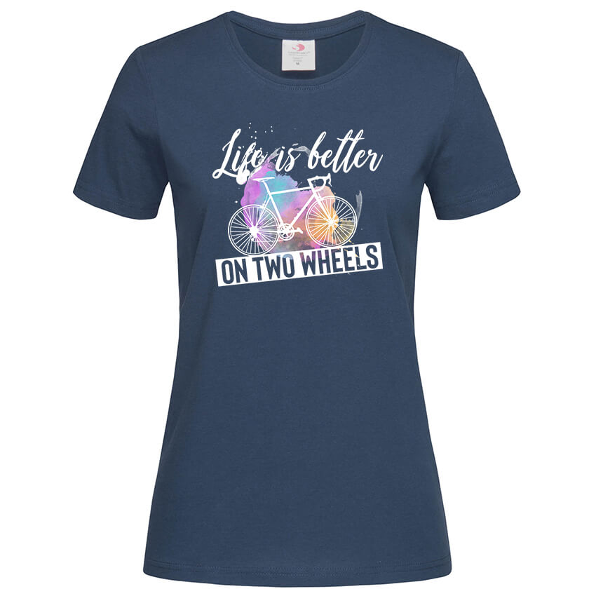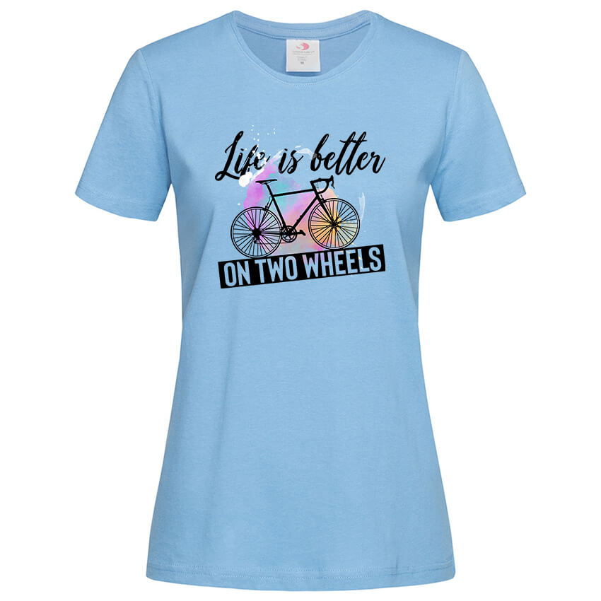 Дамска Тениска On Two Wheels e тениска с щампа, част от колекцията ни тениски за колоездене, създадена от In a MOOD – Онлайн магазин за тениски с щампи и надписи. Ние сме магазинът за настроение и създаваме дизайни на мъжки и дамски тениски. Стараем се да предлагаме забавни и оригинални дизайни на различни теми. Правим тениски, с които Вие да можете да изразите себе си по уникален начин. Ако имате нужда, можем да създадем и тениска по ваш дизайн. Можем също да променим по Ваше желание елементи в някои от предлаганите в магазина щампи и надписи. За целта само се свържете с нас чрез контактната форма на сайта или на email: info@inamood.bg. Предлагаме също така голямо разнообразие от ярки, светли и тъмни цветове – 17 цвята за мъжките и 17 цвята за дамските модели тениски. На различните дизайни сме поставили различни цветове, които пасват със съответния дизайн, но ако Вие искате друг цвят на тениската, не се колебайте да ни попитате. На ваше разположение сме за всякакви въпроси и информация относно магазина и предлаганите от нас продукти. Имаме една основна цел – да зарадваме и усмихнем колкото се може повече хора!