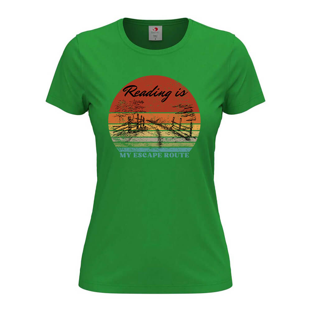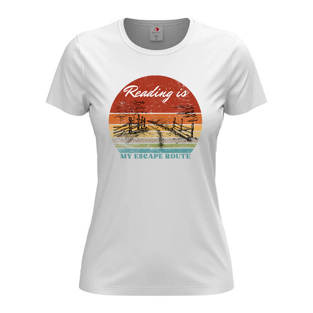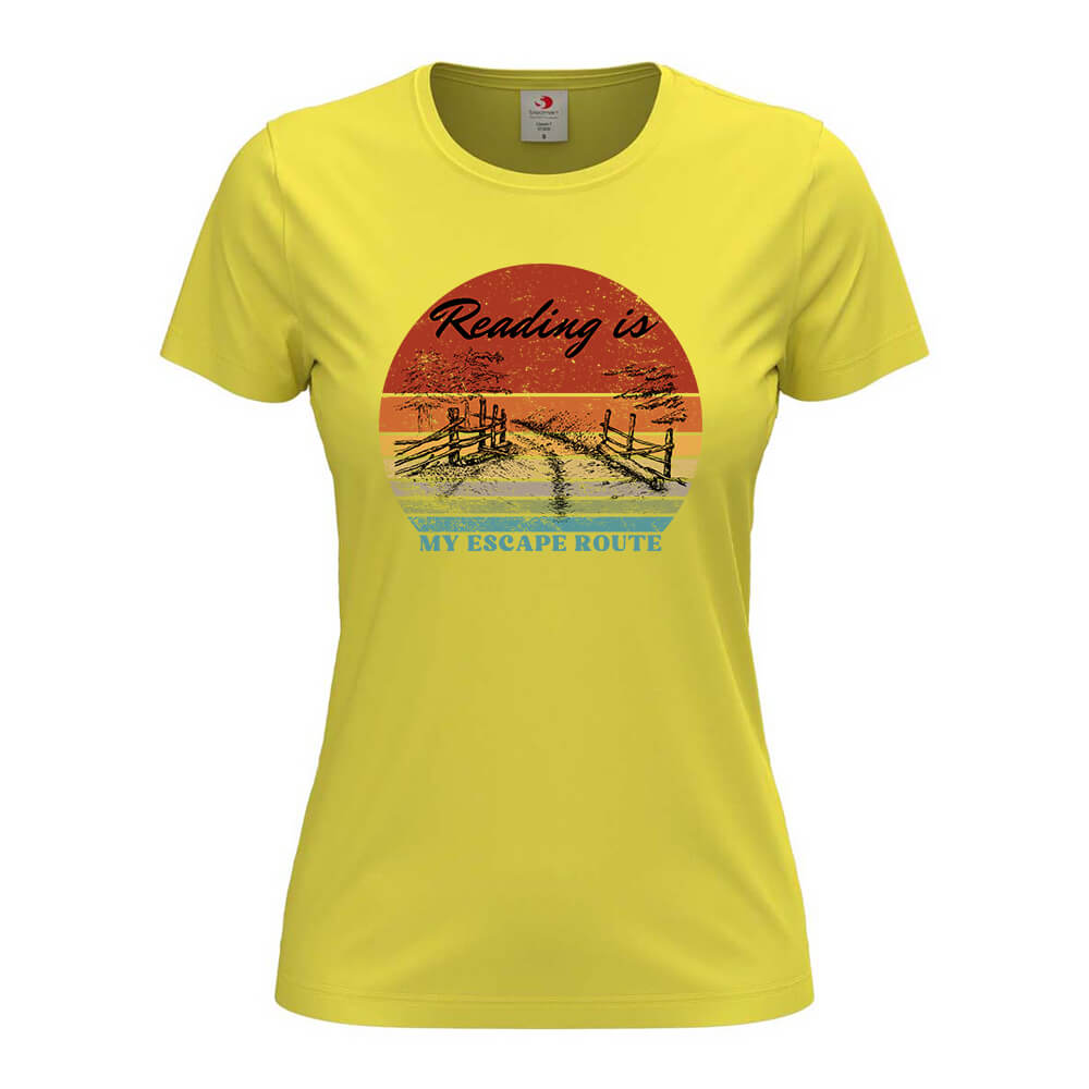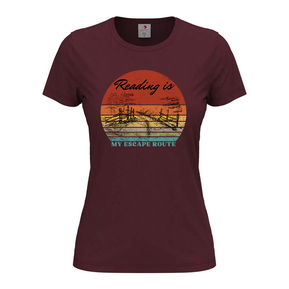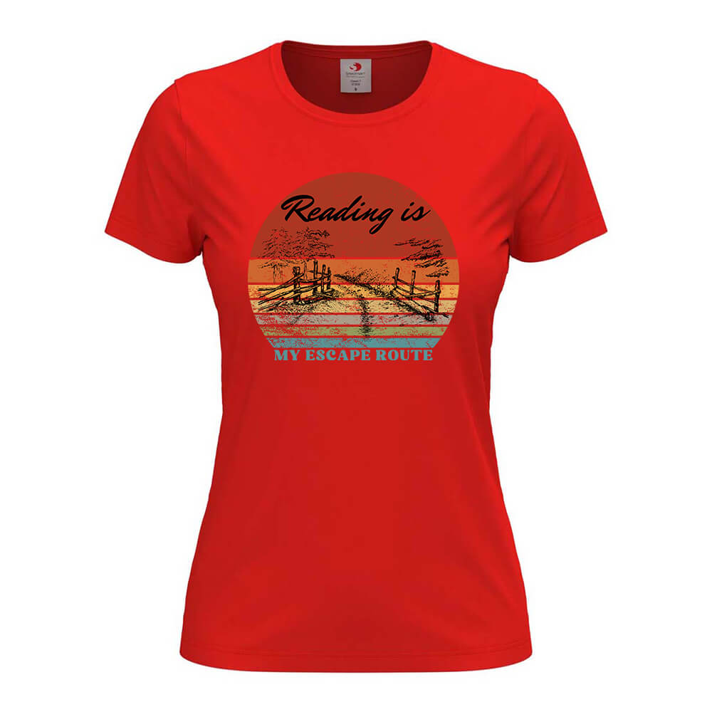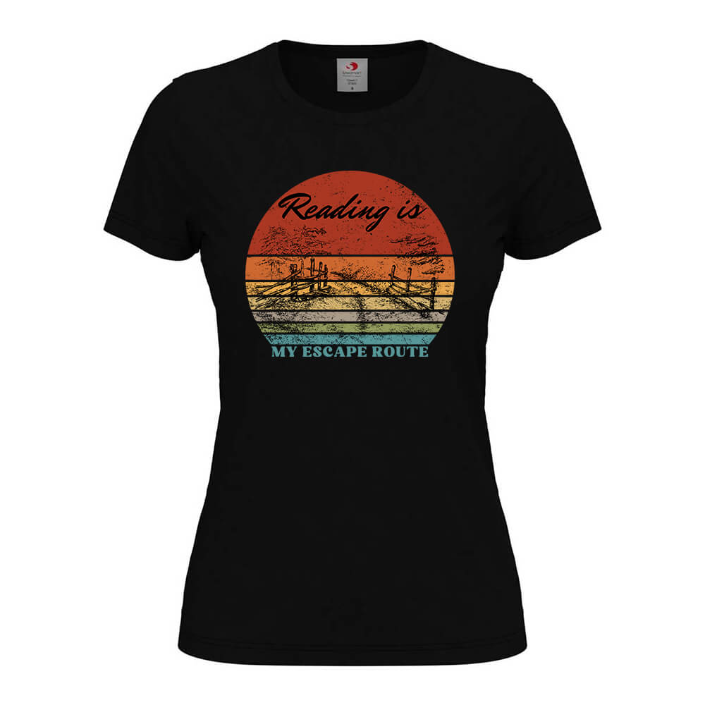 Дамска Тениска Reading Is My Escape Route e тениска с дизайн, създадена от In a MOOD – Онлайн магазин за тениски с щампи и надписи. Ние сме магазинът за настроение и създаваме дизайни на мъжки и дамски тениски. Стараем се да предлагаме забавни и оригинални дизайни на различни теми. Правим тениски, с които Вие да можете да изразите себе си по уникален начин. Ако имате нужда, можем да създадем и тениска по Ваш дизайн. Можем също да променим по Ваше желание елементи в някои от предлаганите в магазина щампи и надписи. За целта само се свържете с нас чрез контактната форма на сайта или на email: info@inamood.bg. Предлагаме също така голямо разнообразие от ярки, светли и тъмни цветове – 17 цвята за мъжките и 17 цвята за дамските модели тениски. На различните дизайни сме поставили различни цветове, които пасват със съответния дизайн, но ако Вие искате друг цвят на тениската, не се колебайте да ни попитате. На Ваше разположение сме за всякакви въпроси и информация относно магазина и предлаганите от нас продукти. Имаме една основна цел – да зарадваме и усмихнем колкото се може повече хора!