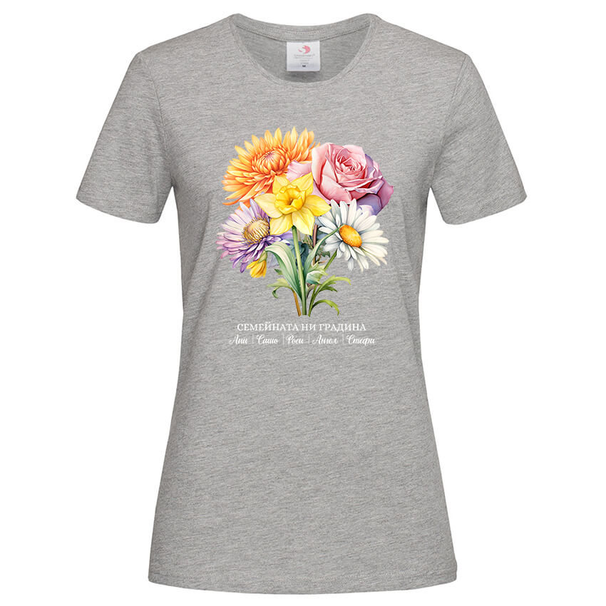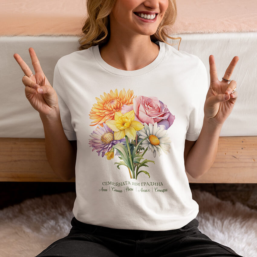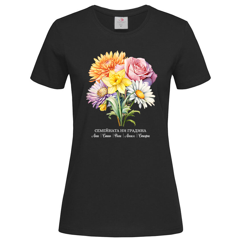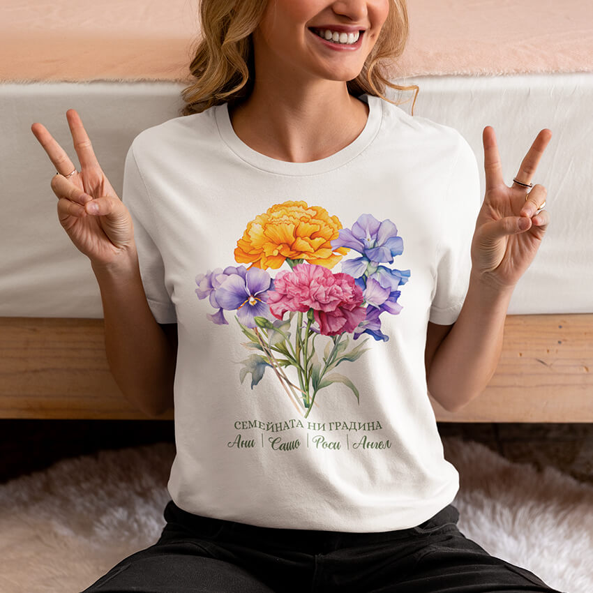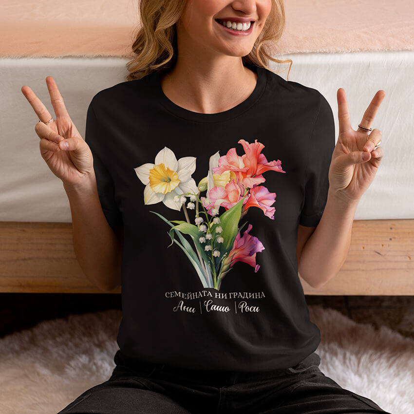 Дамска Тениска Семейната ни Градина e тениска с уникален дизайн с цветя, които отговарят на рождения месец на всеки член от семейството, създадена от In a MOOD – Онлайн магазин за тениски с щампи и надписи. Ние сме магазинът за настроение и създаваме дизайни на мъжки и дамски тениски. Стараем се да предлагаме забавни и оригинални дизайни на различни теми. Правим тениски, с които Вие да можете да изразите себе си по уникален начин. Ако имате нужда, можем да създадем и тениска по ваш дизайн. Можем също да променим по Ваше желание елементи в някои от предлаганите в магазина щампи и надписи. За целта само се свържете с нас чрез контактната форма на сайта или на email: info@inamood.bg. Предлагаме също така голямо разнообразие от ярки, светли и тъмни цветове – 17 цвята за мъжките и 17 цвята за дамските модели тениски. На различните дизайни сме поставили различни цветове, които пасват със съответния дизайн, но ако Вие искате друг цвят на тениската, не се колебайте да ни попитате. На ваше разположение сме за всякакви въпроси и информация относно магазина и предлаганите от нас продукти. Имаме една основна цел – да зарадваме и усмихнем колкото се може повече хора!