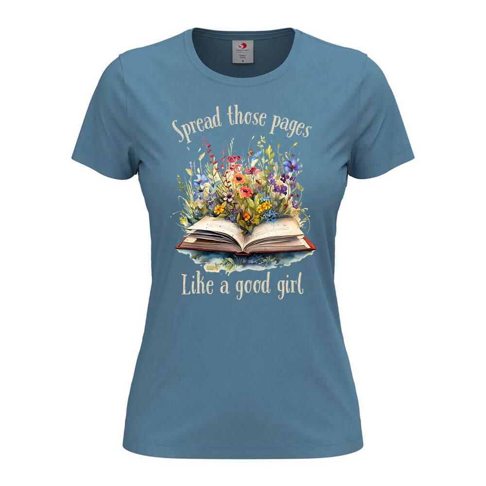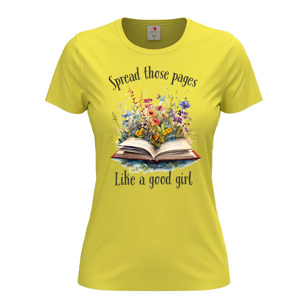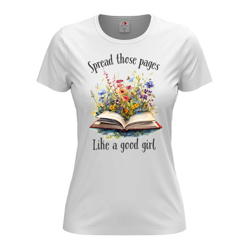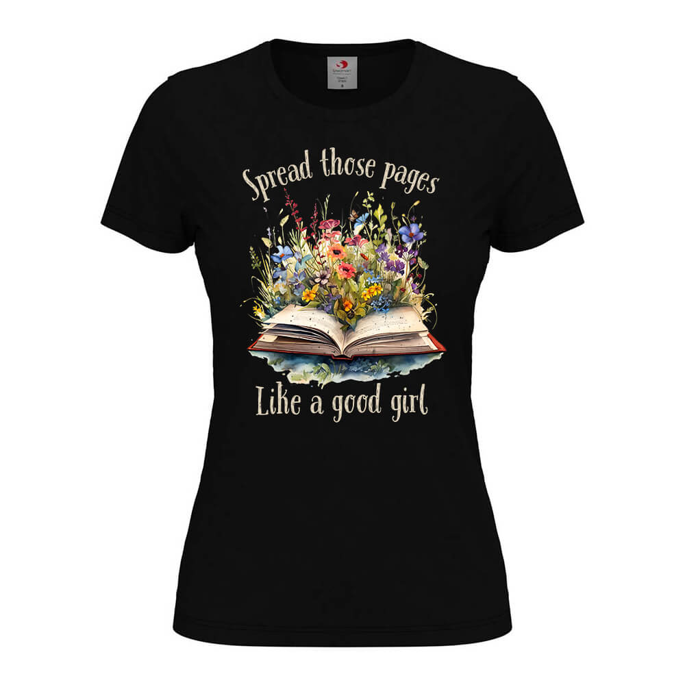 Дамска Тениска Spread Those Pages e тениска с дизайн, създадена от In a MOOD – Онлайн магазин за тениски с щампи и надписи. Ние сме магазинът за настроение и създаваме дизайни на мъжки и дамски тениски. Стараем се да предлагаме забавни и оригинални дизайни на различни теми. Правим тениски, с които Вие да можете да изразите себе си по уникален начин. Ако имате нужда, можем да създадем и тениска по Ваш дизайн. Можем също да променим по Ваше желание елементи в някои от предлаганите в магазина щампи и надписи. За целта само се свържете с нас чрез контактната форма на сайта или на email: info@inamood.bg. Предлагаме също така голямо разнообразие от ярки, светли и тъмни цветове – 17 цвята за мъжките и 17 цвята за дамските модели тениски. На различните дизайни сме поставили различни цветове, които пасват със съответния дизайн, но ако Вие искате друг цвят на тениската, не се колебайте да ни попитате. На Ваше разположение сме за всякакви въпроси и информация относно магазина и предлаганите от нас продукти. Имаме една основна цел – да зарадваме и усмихнем колкото се може повече хора!