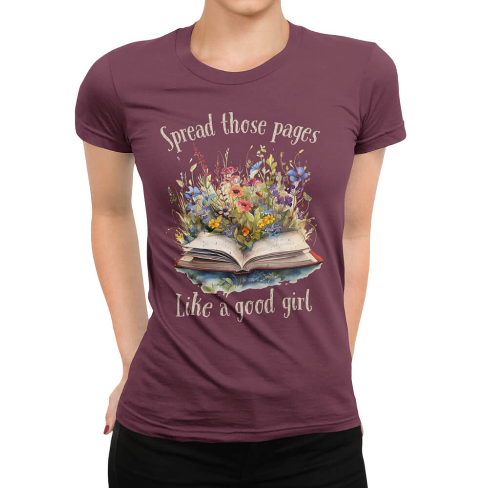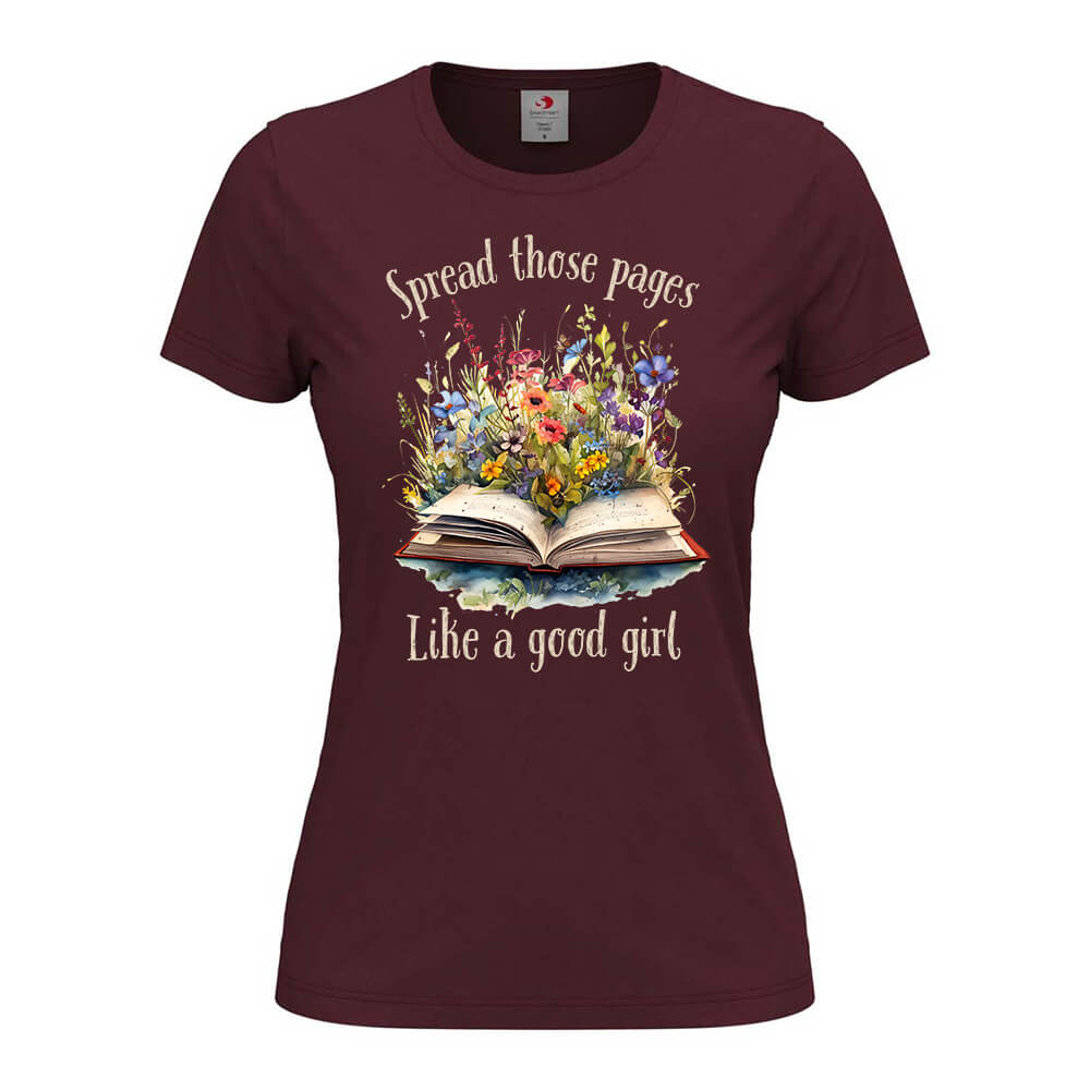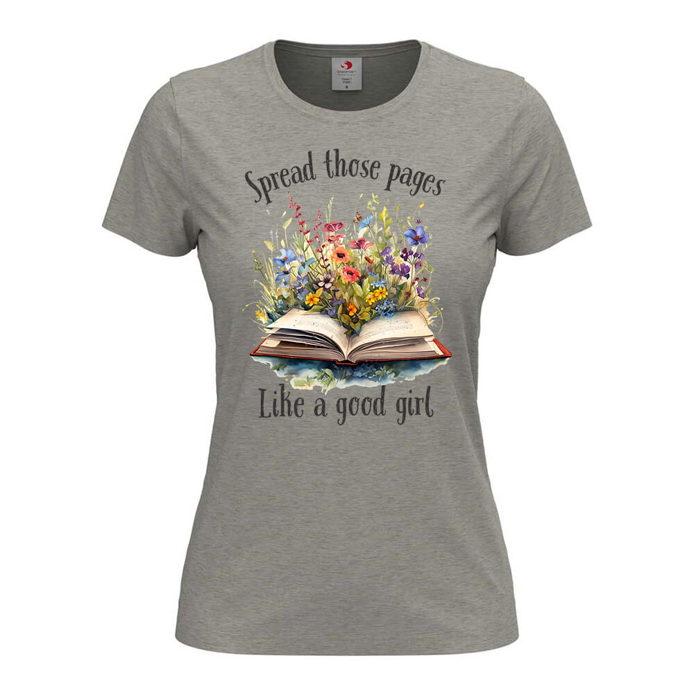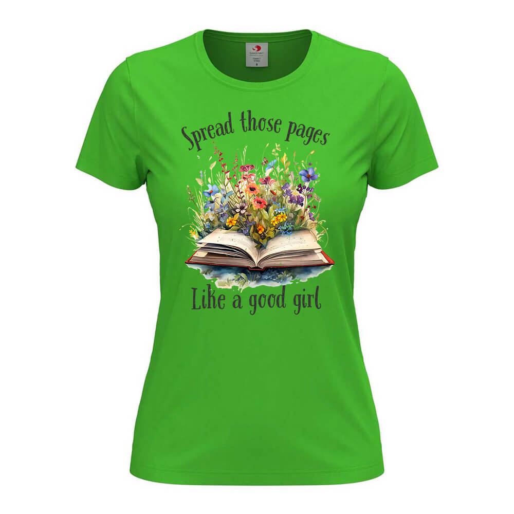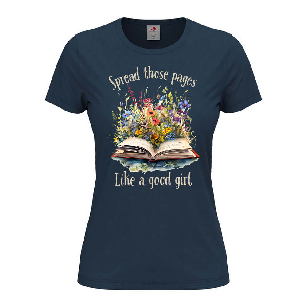 Дамска Тениска Spread Those Pages e тениска с дизайн, създадена от In a MOOD – Онлайн магазин за тениски с щампи и надписи. Ние сме магазинът за настроение и създаваме дизайни на мъжки и дамски тениски. Стараем се да предлагаме забавни и оригинални дизайни на различни теми. Правим тениски, с които Вие да можете да изразите себе си по уникален начин. Ако имате нужда, можем да създадем и тениска по Ваш дизайн. Можем също да променим по Ваше желание елементи в някои от предлаганите в магазина щампи и надписи. За целта само се свържете с нас чрез контактната форма на сайта или на email: info@inamood.bg. Предлагаме също така голямо разнообразие от ярки, светли и тъмни цветове – 17 цвята за мъжките и 17 цвята за дамските модели тениски. На различните дизайни сме поставили различни цветове, които пасват със съответния дизайн, но ако Вие искате друг цвят на тениската, не се колебайте да ни попитате. На Ваше разположение сме за всякакви въпроси и информация относно магазина и предлаганите от нас продукти. Имаме една основна цел – да зарадваме и усмихнем колкото се може повече хора!