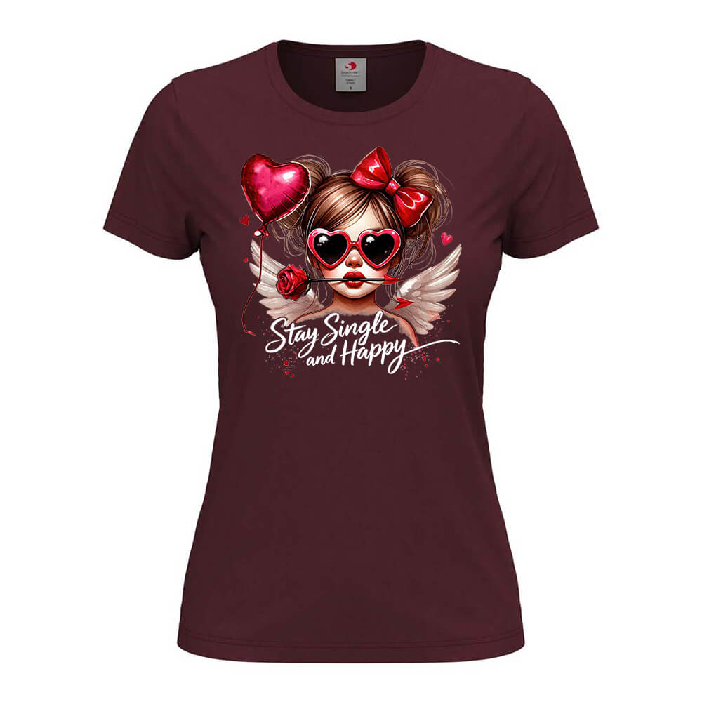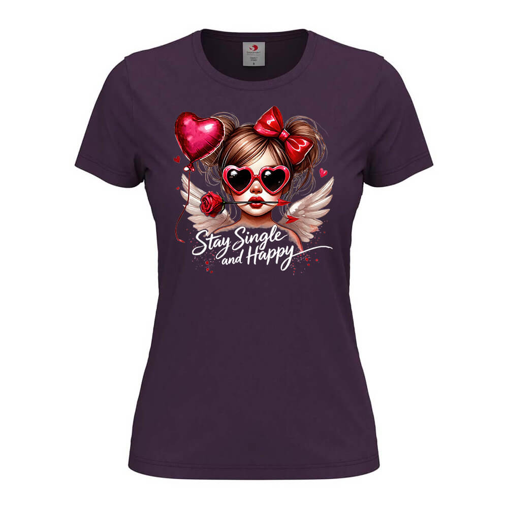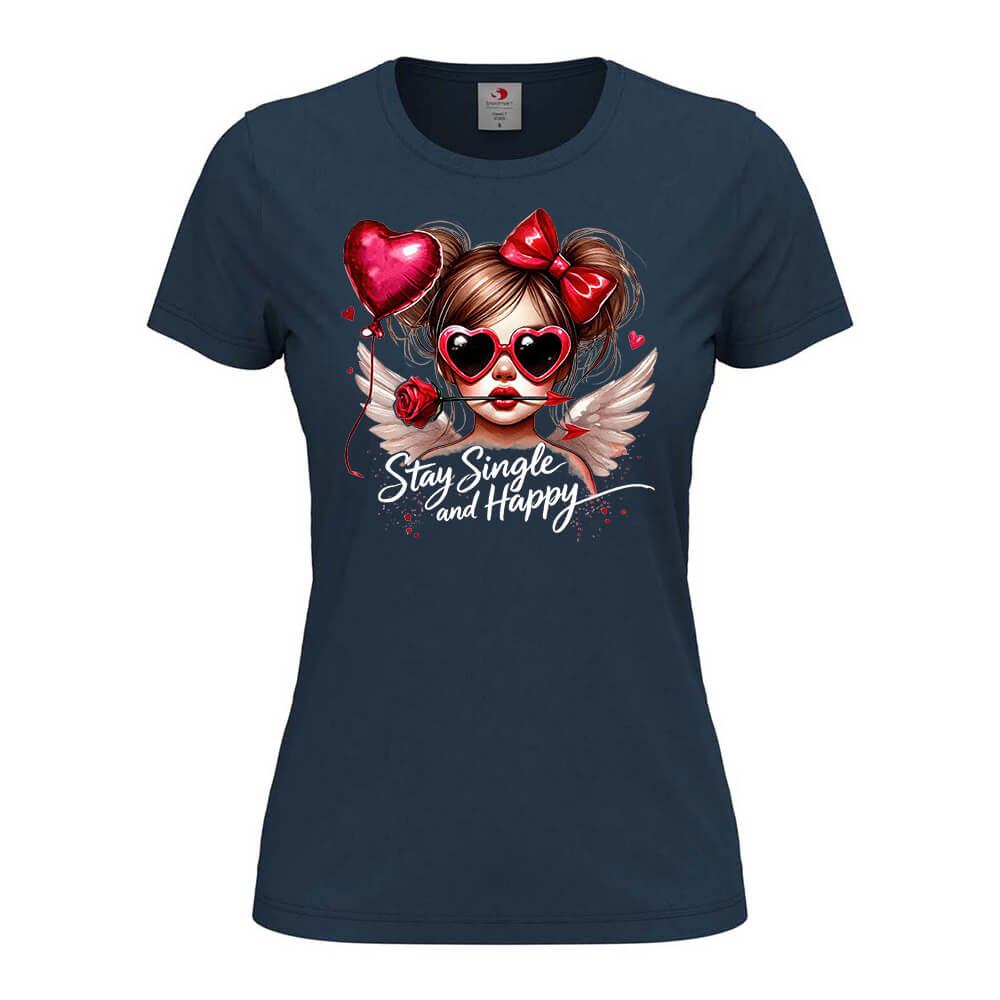 Дамска Тениска Stay Single And Happy e тениска за момичетата, които не се притесняват от това да са сами на Свети Валентин, създадена от In a MOOD – Онлайн магазин за тениски с щампи и надписи. Ние сме магазинът за настроение и създаваме дизайни на мъжки и дамски тениски. Стараем се да предлагаме забавни и оригинални дизайни на различни теми. Правим тениски, с които Вие да можете да изразите себе си по уникален начин. Ако имате нужда, можем да създадем и тениска по Ваш дизайн. Можем също да променим по Ваше желание елементи в някои от предлаганите в магазина щампи и надписи. За целта само се свържете с нас чрез контактната форма на сайта или на email: info@inamood.bg. Предлагаме също така голямо разнообразие от ярки, светли и тъмни цветове – 17 цвята за мъжките и 17 цвята за дамските модели тениски. На различните дизайни сме поставили различни цветове, които пасват със съответния дизайн, но ако Вие искате друг цвят на тениската, не се колебайте да ни попитате. На Ваше разположение сме за всякакви въпроси и информация относно магазина и предлаганите от нас продукти. Имаме една основна цел – да зарадваме и усмихнем колкото се може повече хора!