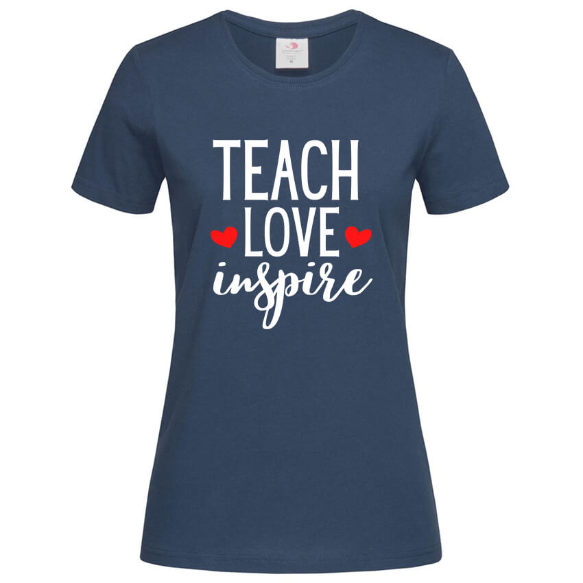 Дамска тениска Teach Love Inspire e тениска с красив надпис, част от колекцията ни с тениски за учители създадена от In a MOOD – Онлайн магазин за тениски с щампи и надписи. Ние сме магазинът за настроение и създаваме дизайни на мъжки и дамски тениски. Стараем се да предлагаме забавни и оригинални дизайни на различни теми. Правим тениски, с които Вие да можете да изразите себе си по уникален начин. Ако имате нужда, можем да създадем и тениска по ваш дизайн. Можем също да променим по Ваше желание елементи в някои от предлаганите в магазина щампи и надписи. За целта само се свържете с нас чрез контактната форма на сайта или на email: info@inamood.bg. Предлагаме също така голямо разнообразие от ярки, светли и тъмни цветове – 17 цвята за мъжките и 17 цвята за дамските модели тениски. На различните дизайни сме поставили различни цветове, които пасват със съответния дизайн, но ако Вие искате друг цвят на тениската, не се колебайте да ни попитате. На ваше разположение сме за всякакви въпроси и информация относно магазина и предлаганите от нас продукти. Имаме една основна цел – да зарадваме и усмихнем колкото се може повече хора!