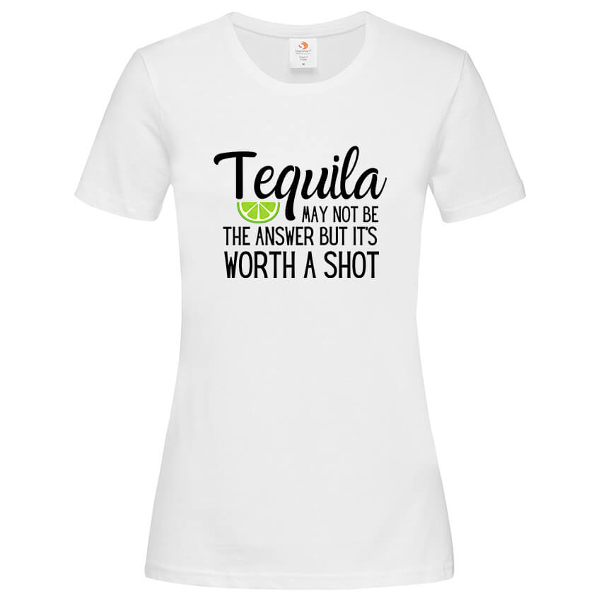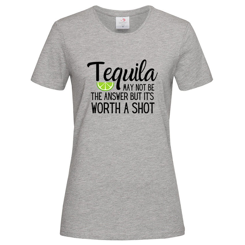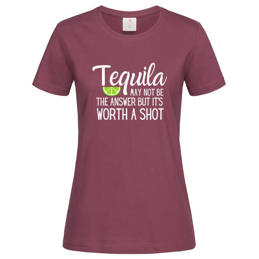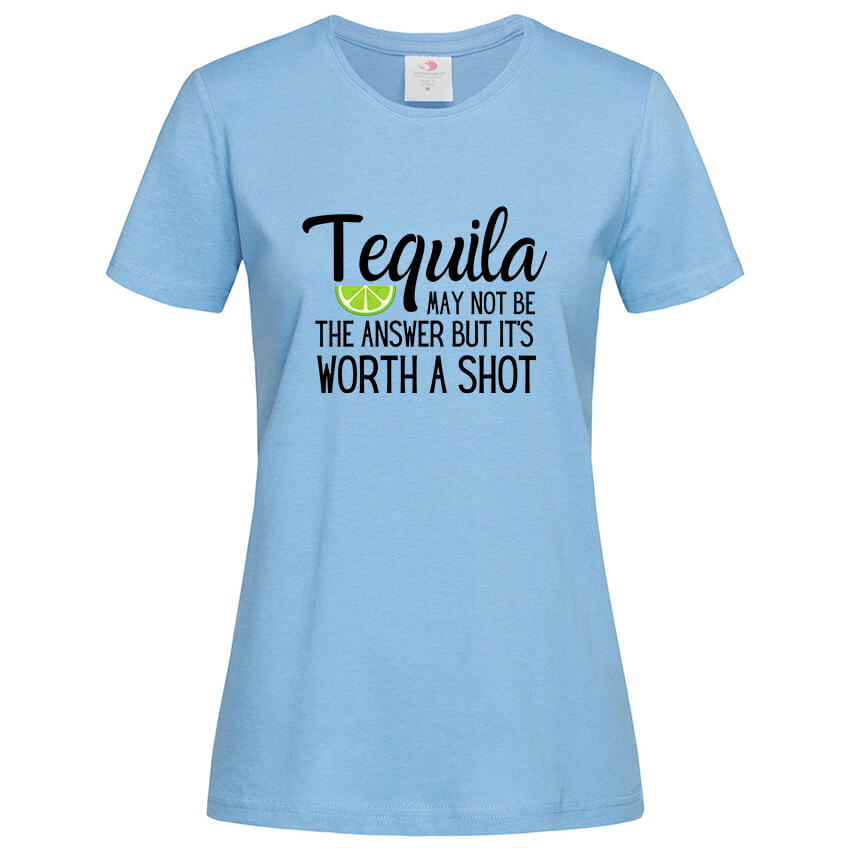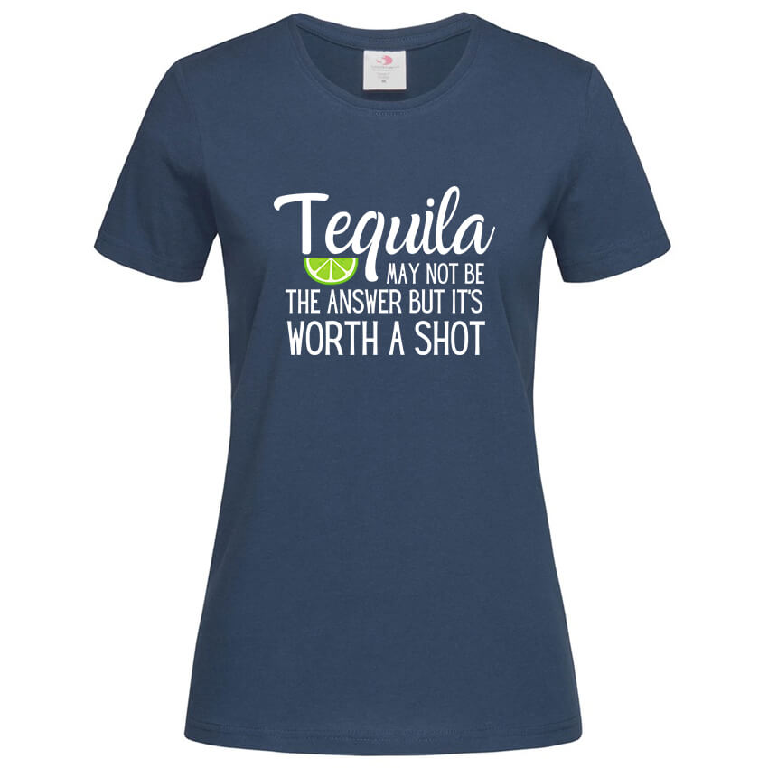 Дамска тениска Tequila e тениска със забавен надпис, създадена от In a MOOD – Онлайн магазин за тениски с щампи и надписи. Ние сме магазинът за настроение и създаваме дизайни на мъжки и дамски тениски. Стараем се да предлагаме забавни и оригинални дизайни на различни теми. Правим тениски, с които Вие да можете да изразите себе си по уникален начин. Ако имате нужда, можем да създадем и тениска по ваш дизайн. Можем също да променим по Ваше желание елементи в някои от предлаганите в магазина щампи и надписи. За целта само се свържете с нас чрез контактната форма на сайта или на email: info@inamood.bg. Предлагаме също така голямо разнообразие от ярки, светли и тъмни цветове – 17 цвята за мъжките и 17 цвята за дамските модели тениски. На различните дизайни сме поставили различни цветове, които пасват със съответния дизайн, но ако Вие искате друг цвят на тениската, не се колебайте да ни попитате. На ваше разположение сме за всякакви въпроси и информация относно магазина и предлаганите от нас продукти. Имаме една основна цел – да зарадваме и усмихнем колкото се може повече хора!