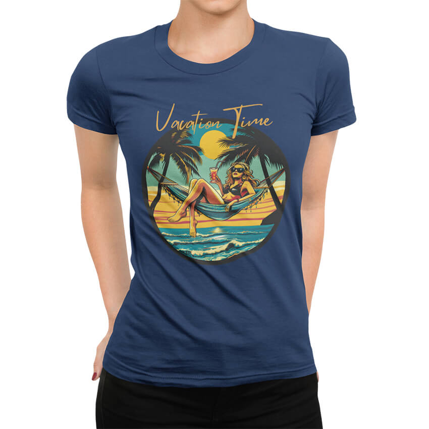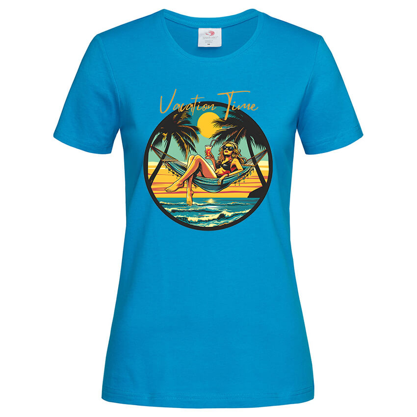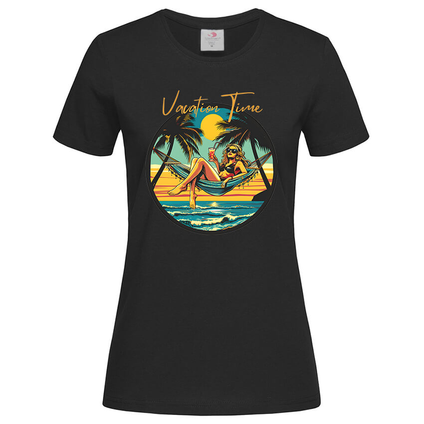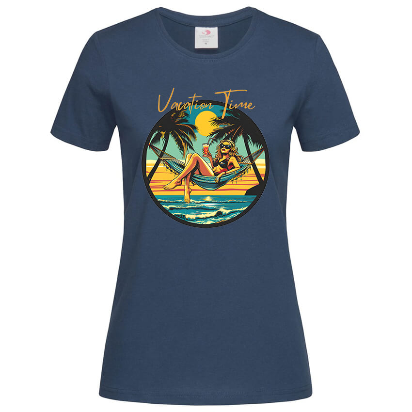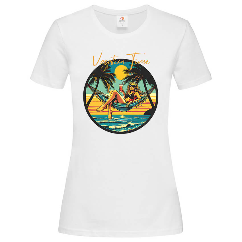 Дамска Тениска Vacation Time e тениска с готина щампа, идеална за лятната почивка, създадена от In a MOOD – Онлайн магазин за тениски с щампи и надписи. Ние сме магазинът за настроение и създаваме дизайни на мъжки и дамски тениски. Стараем се да предлагаме забавни и оригинални дизайни на различни теми. Правим тениски, с които Вие да можете да изразите себе си по уникален начин. Ако имате нужда, можем да създадем и тениска по ваш дизайн. Можем също да променим по Ваше желание елементи в някои от предлаганите в магазина щампи и надписи. За целта само се свържете с нас чрез контактната форма на сайта или на email: info@inamood.bg.