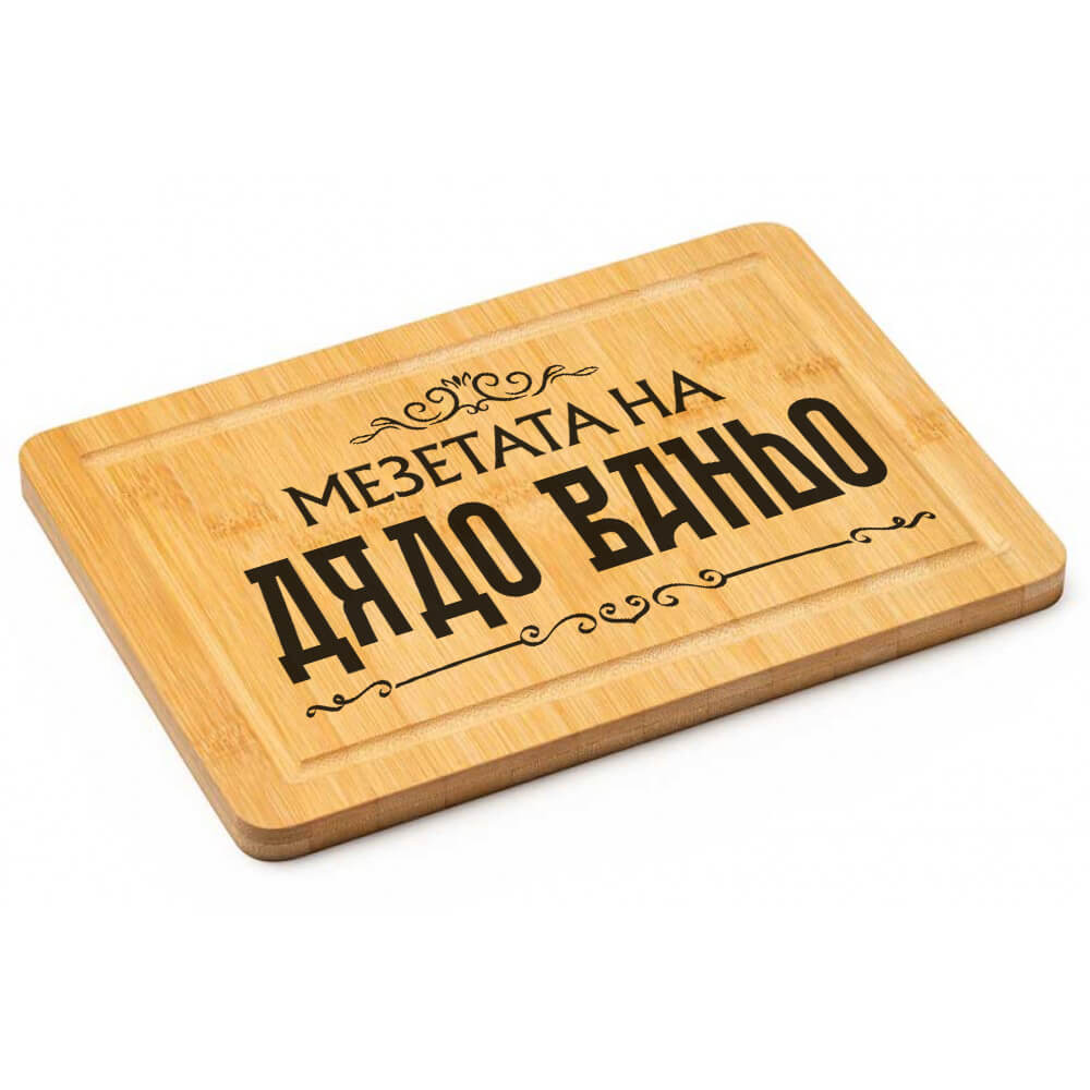 Гравирана дъска за рязане Мезетата на Дядо – смени името и подари нова дъска за мезетата на дядо