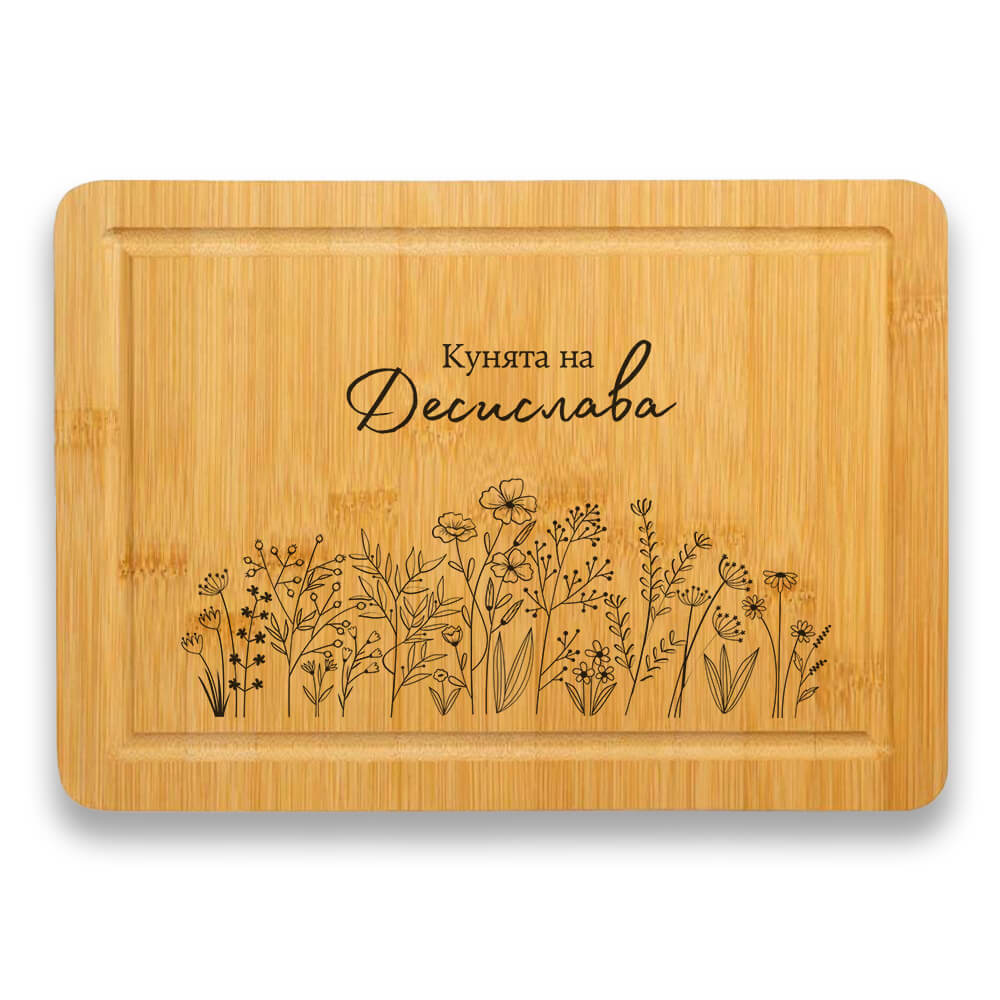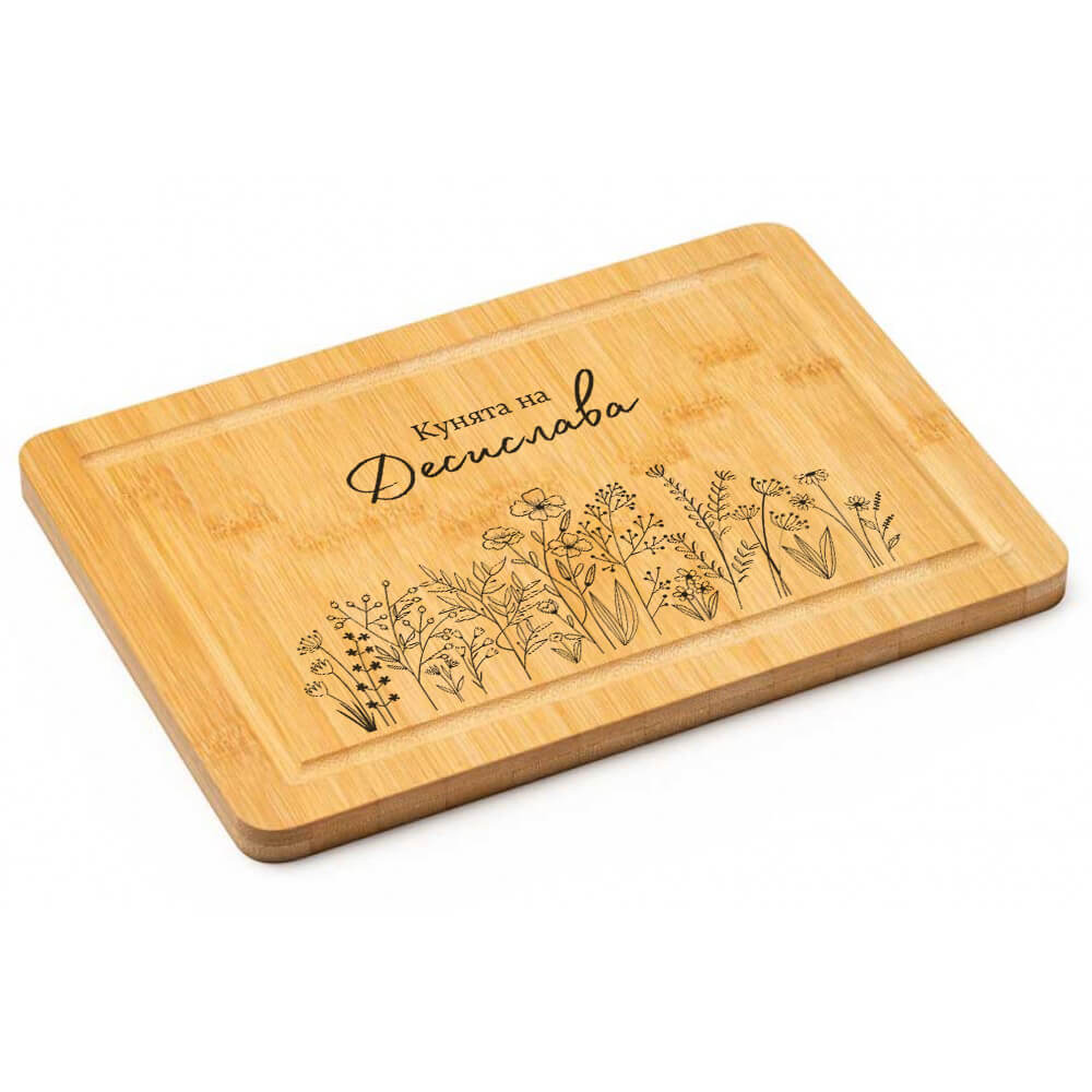 Изработена от естествен бамбук в правоъгълна форма със заоблени ъгли и със специално оформени улеи за течности, тя е подходяща както за рязане, така и за сервиране. Може да я ползваш като забележителна дъска за мезета, когато ти дойдат гости. А ако търсиш гравирана дъска за подарък, тук си на точното място – майки, татковци, приятелки, половинки – можем да направим по нещичко за всеки. Ако не намираш точния дизайн, не се колебай да се свържеш с нас през чат, телефон, мейл >> Информация за контакт.