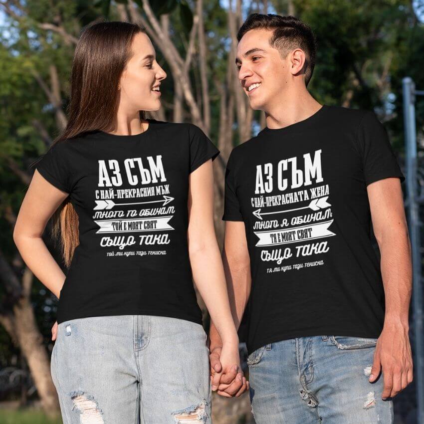 Комплект от тениски за двойки с щампа, създаден от In a MOOD – Онлайн магазин за тениски с щампи и надписи. Ние сме магазинът за настроение и създаваме дизайни на мъжки и дамски тениски. Стараем се да предлагаме забавни и оригинални дизайни на различни теми. Правим тениски, с които Вие да можете да изразите себе си по уникален начин. Ако имате нужда, можем да създадем и тениска по ваш дизайн. Можем също да променим по Ваше желание елементи в някои от предлаганите в магазина щампи и надписи. За целта само се свържете с нас чрез контактната форма на сайта или на email: info@inamood.bg. Предлагаме също така голямо разнообразие от ярки, светли и тъмни цветове – 17 цвята за мъжките и 17 цвята за дамските модели тениски. На различните дизайни сме поставили различни цветове, които пасват със съответния дизайн, но ако Вие искате друг цвят на тениската, не се колебайте да ни попитате. На ваше разположение сме за всякакви въпроси и информация относно магазина и предлаганите от нас продукти. Имаме една основна цел – да зарадваме и усмихнем колкото се може повече хора!