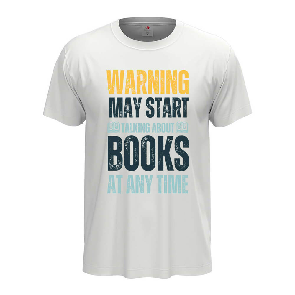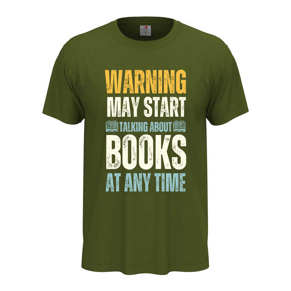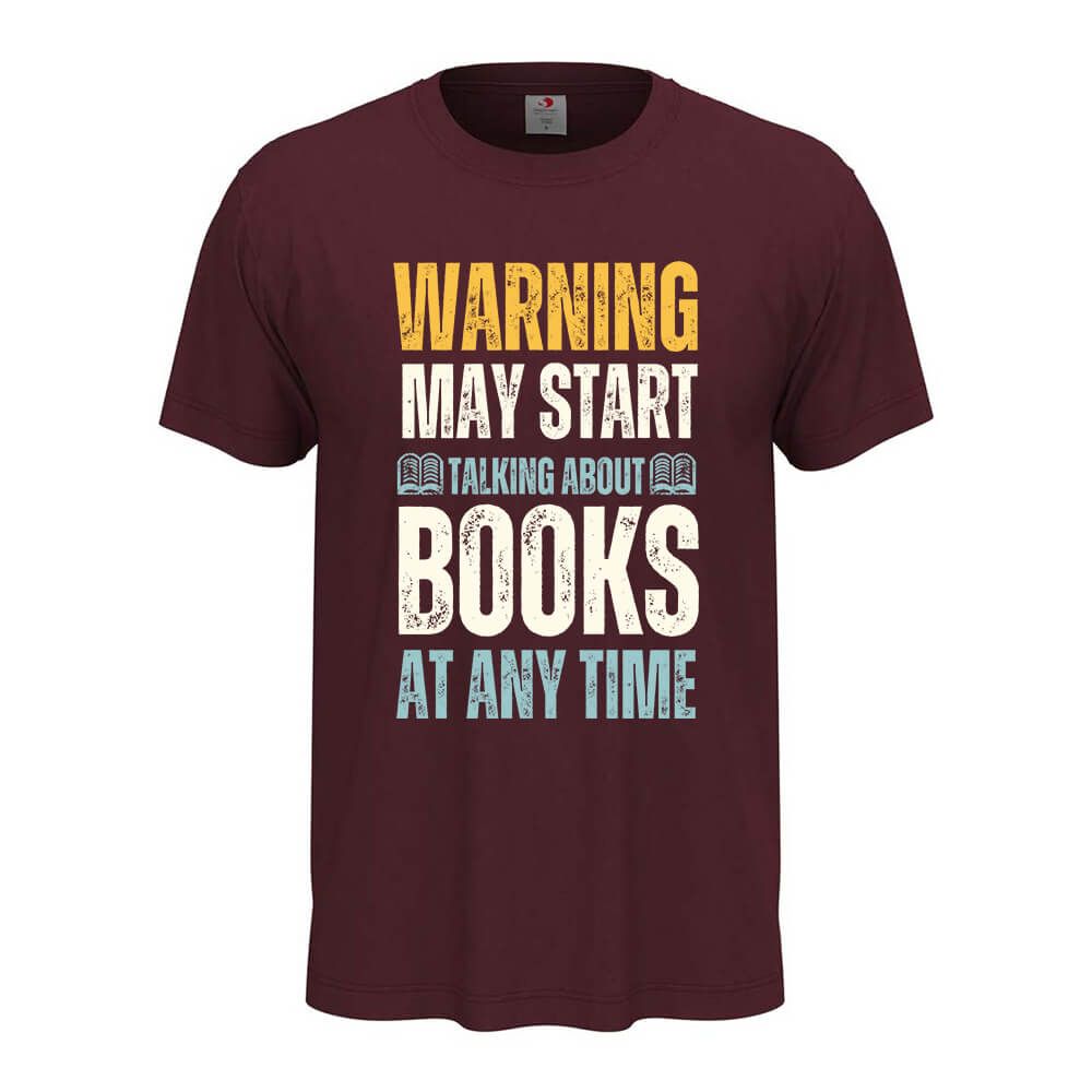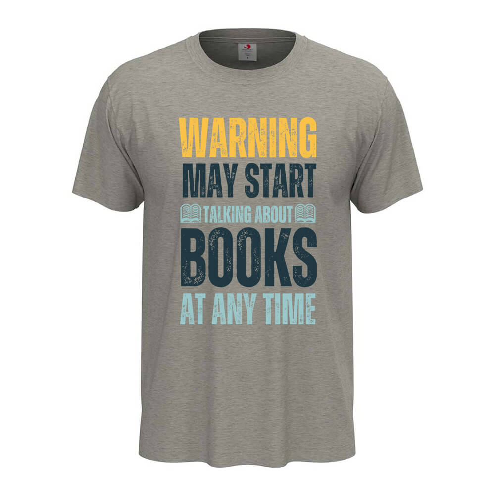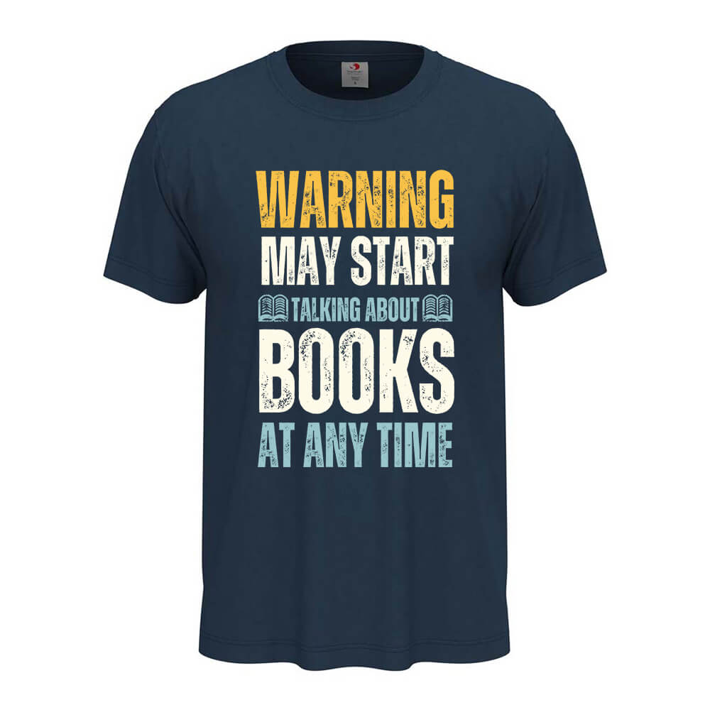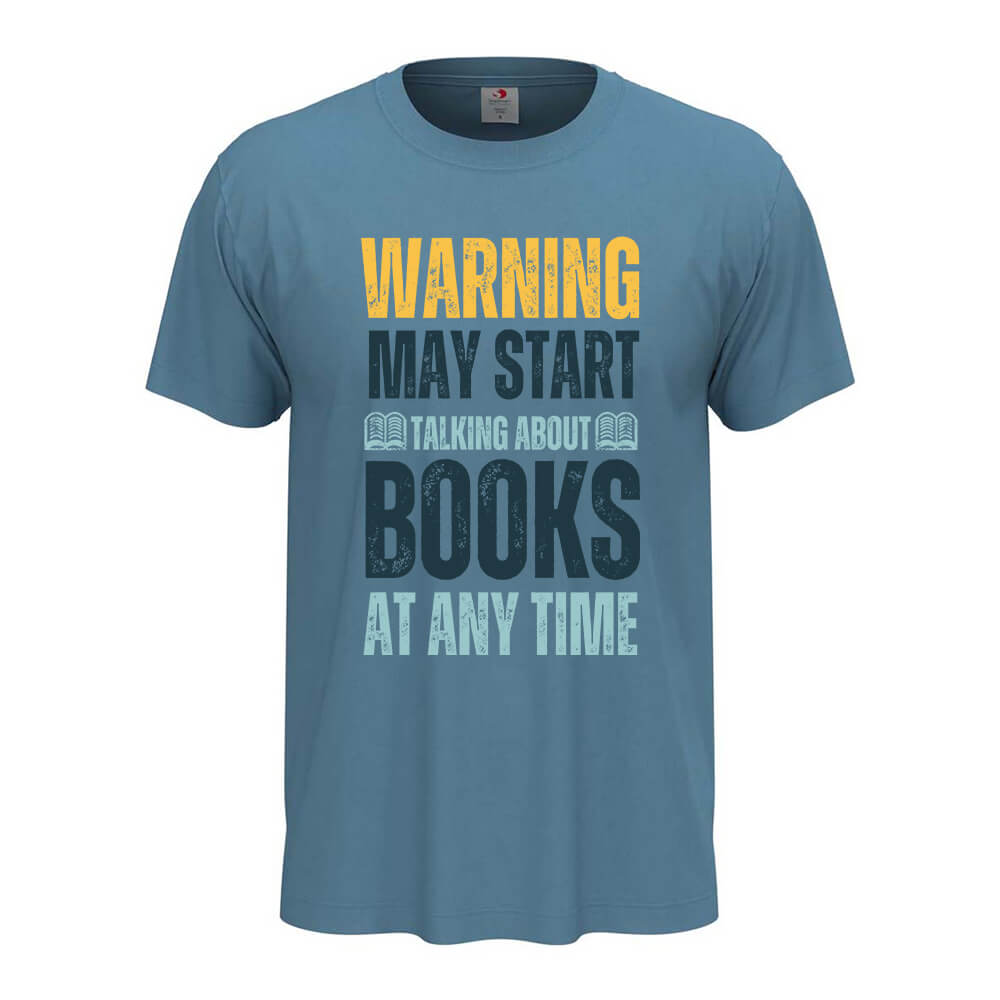 Мъжка Тениска May Start Talking About Books e тениска със забавен дизайн, създадена от In a MOOD – Онлайн магазин за тениски с щампи и надписи. Ние сме магазинът за настроение и създаваме дизайни на мъжки и дамски тениски. Стараем се да предлагаме забавни и оригинални дизайни на различни теми. Правим тениски, с които Вие да можете да изразите себе си по уникален начин. Ако имате нужда, можем да създадем и тениска по Ваш дизайн. Можем също да променим по Ваше желание елементи в някои от предлаганите в магазина щампи и надписи. За целта само се свържете с нас чрез контактната форма на сайта или на email: info@inamood.bg. Предлагаме също така голямо разнообразие от ярки, светли и тъмни цветове – 17 цвята за мъжките и 17 цвята за дамските модели тениски. На различните дизайни сме поставили различни цветове, които пасват със съответния дизайн, но ако Вие искате друг цвят на тениската, не се колебайте да ни попитате. На Ваше разположение сме за всякакви въпроси и информация относно магазина и предлаганите от нас продукти. Имаме една основна цел – да зарадваме и усмихнем колкото се може повече хора!